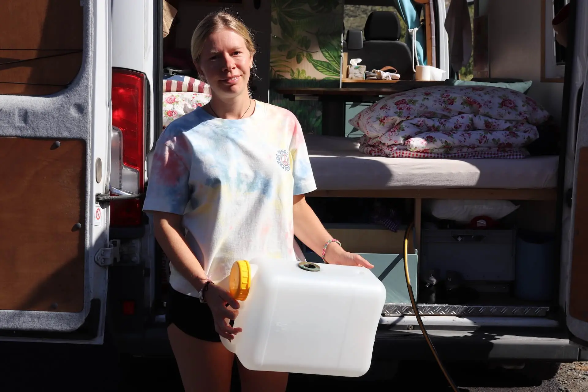 Wir sind froh, dass wir in unserer Van einen 126L großen Frischwassertank* und einen 93L großen Abwassertank* eingebaut haben. So können wir für mehrere Tage an einem schönen Platz oder in einer Gegend bleiben, ohne unser Wasser auffüllen oder entleeren zu müssen.
