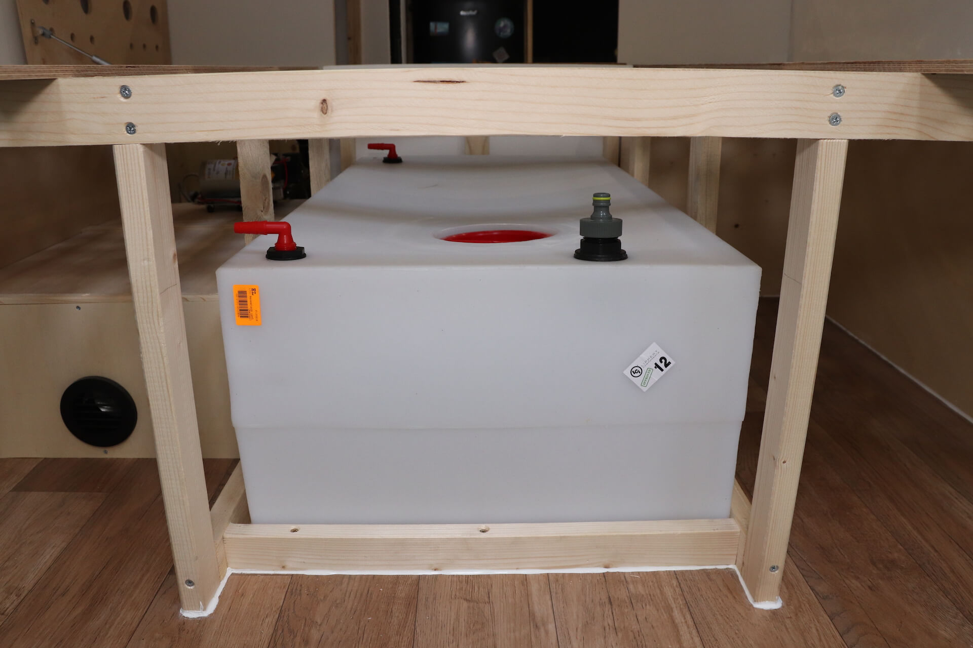Unserer Meinung nach ist es – sofern man Platz hat – immer besser einen größeren Tank einzubauen, weil dies auch gleichzeitig Freiheit und Flexibilität bedeutet. Man muss ihn ja nicht zwingend randvoll machen. Da wir in unserem Fiat Ducato auch eine Dusche haben, entcheiden wir uns für einen 126 Liter großen Frischwassertank*, welcher sind unter dem fest verbauten Teil vom Bett befindet. Der 93 Liter große Abwassertank* befindet sich außen, unter dem Fahrzeugboden.