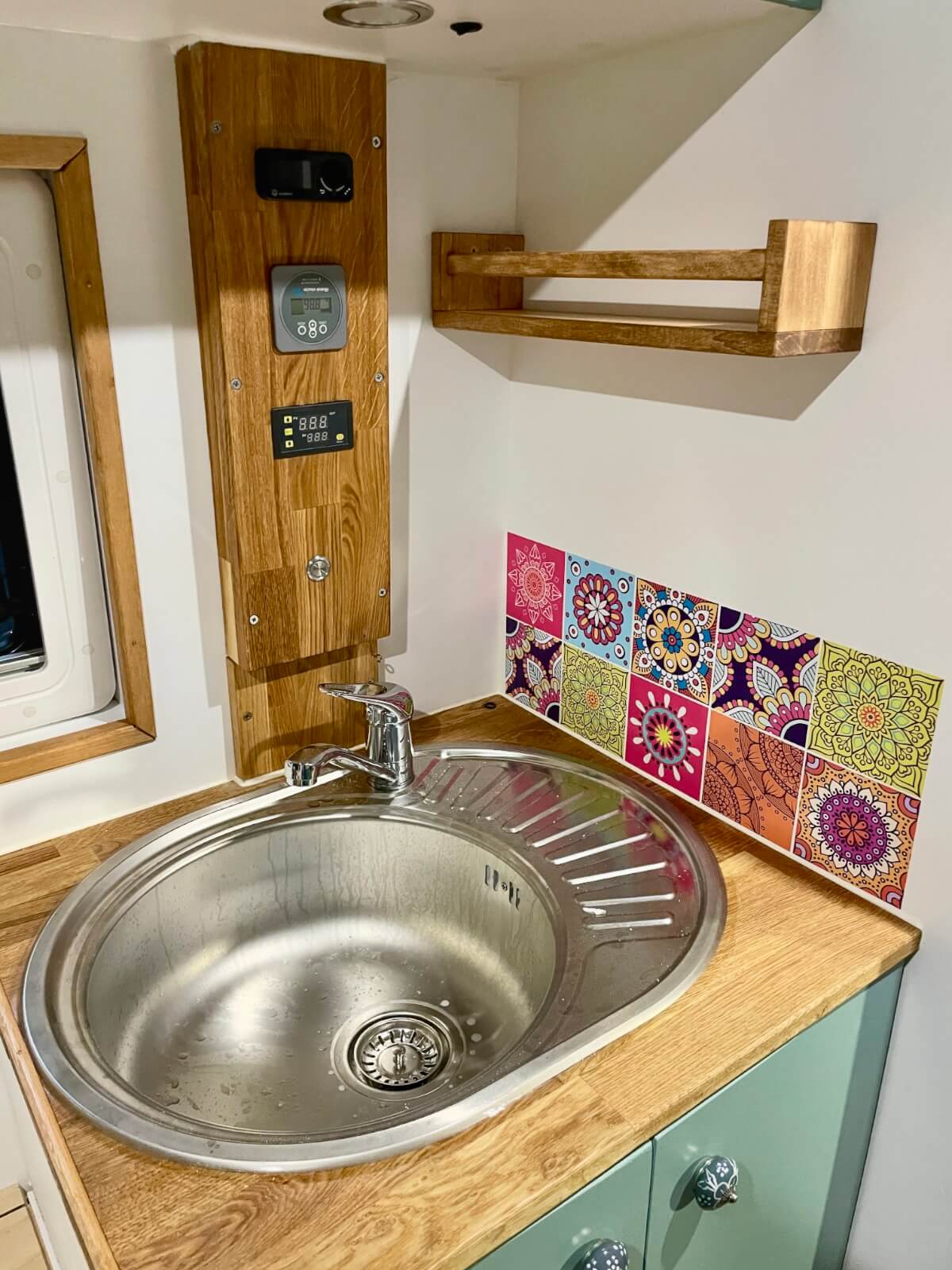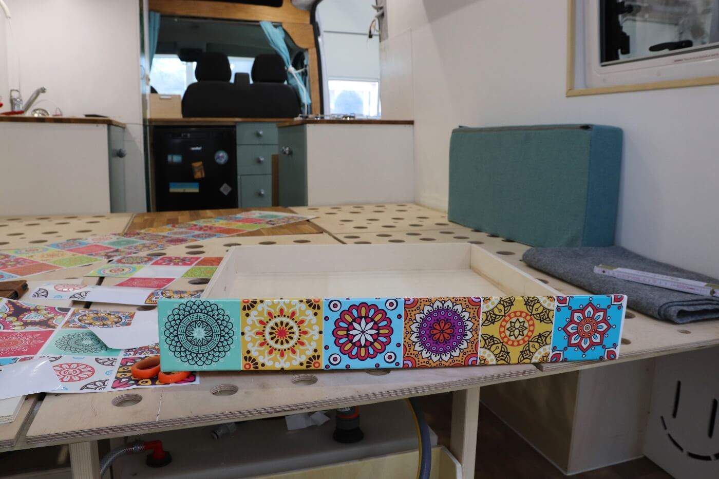 Klebefliesen bringen Farbe in den Van und lassen sich leicht anbringen. Unsere Küche haben wir mit Klebefliesen dekoriert. Diese sind hitzebeständig und abwischbar und eignen sich damit perfekt um den Van zu verschönern. Klebefliesen gibt es in vielen verschiedenen Farben und Designs.