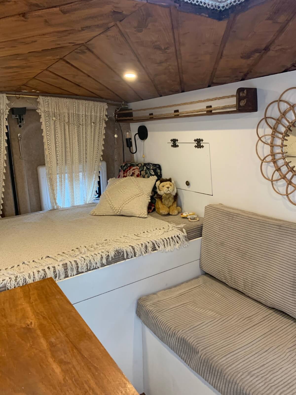 Diese Variante ist besonders praktisch wenn du nur begrenzten Platz zur Verfügung hast. Wir haben uns für eine Sitzecke zum umbauen entschieden und diese mit unserem Längsbett kombiniert. Innerhalb von zwei Minuten wird unser Bett so zu einer komfortablen Sitzecke. Nachts fahren wir den Hubtisch* runter und haben so eine Auflagefläche für unser Bett. Unser Bett hat eine Größe von 1,80 x 1,80m und so haben wir viel Platz zum Sitzen und auch viel Platz zum Schlafen. Auf dem fest verbauten Teil vom Bett lagern wir die Bettwäsche und auch tagsüber ist hier genug Platz um im Bett zu liegen, ohne dass man es extra umbauen muss.