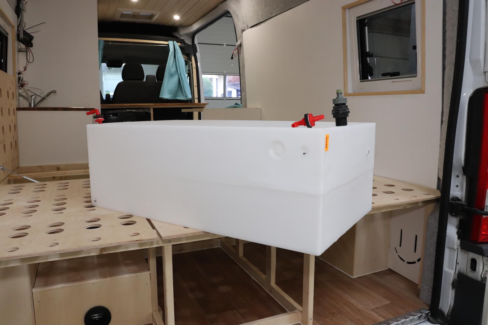 Wenn du mit deinem Camper für mehrere Tage autark unterwegs sein möchtest, dann solltest du auf einen ausreichend großen Frischwassertank achten. Wir haben uns für einen 126 Liter großen Frischwassertank* entschieden, welcher sich unter dem fest verbauten Platz vom Bett befindet. Für einen kleinen Van reicht auch ein 20 Liter großer Kanister unter dem Waschbecken.