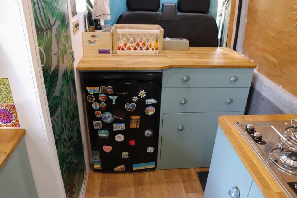 Um die Lebensmittel zu kühlen eignet sich ein Kompressorkühlschrank, der auf 12 V läuft. Kompressorkühlschränke gibt es in verschiedenen Grössen und eignen sich somit auch für kleinere Vans. Eine andere Option ist eine elektrische Kühlbox.