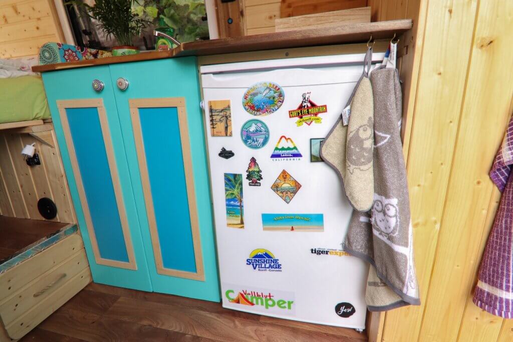 Wir haben die Küche zum Schluss gebaut, nachdem das Grundgerüst für das Bett und die Nasszelle bereits standen. Den verbleibenden Platz haben wir für die Küchenschränke genutzt. In unserer Indoor Küche können wir auch bei Regen kochen und haben abgesehen von einem Backofen alles dabei, was wir brauchen.