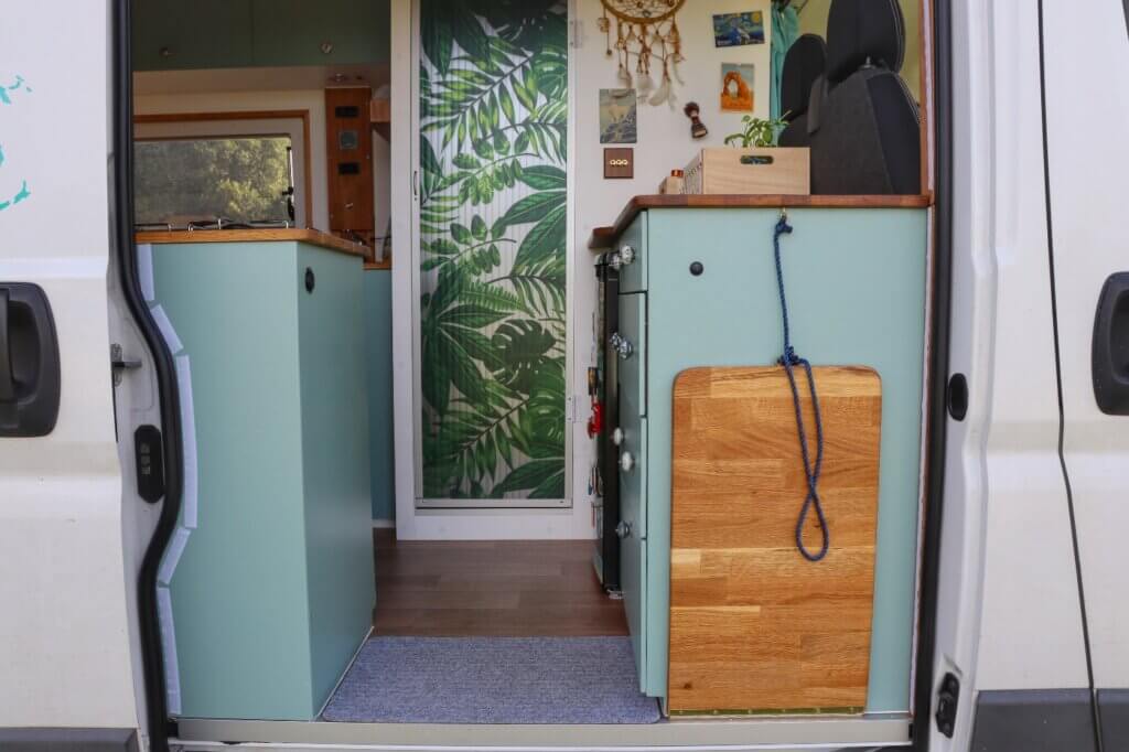 In unserem ersten Ausbau haben wir unsere Wandverkleidung sowie die Decke mit Profilholz verkleidet. Im zweiten Ausbau haben wir an den Wänden weiß lackiertes Pappelsperrholz angebracht und an der Decke Profilholz, welches wir mit Hartwachsöl gestrichen haben. Unsere Mäbel haben wir in aventuringrün gestrichen und so einen tollen Kontrast geschaffen.