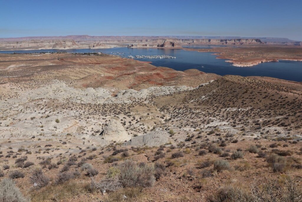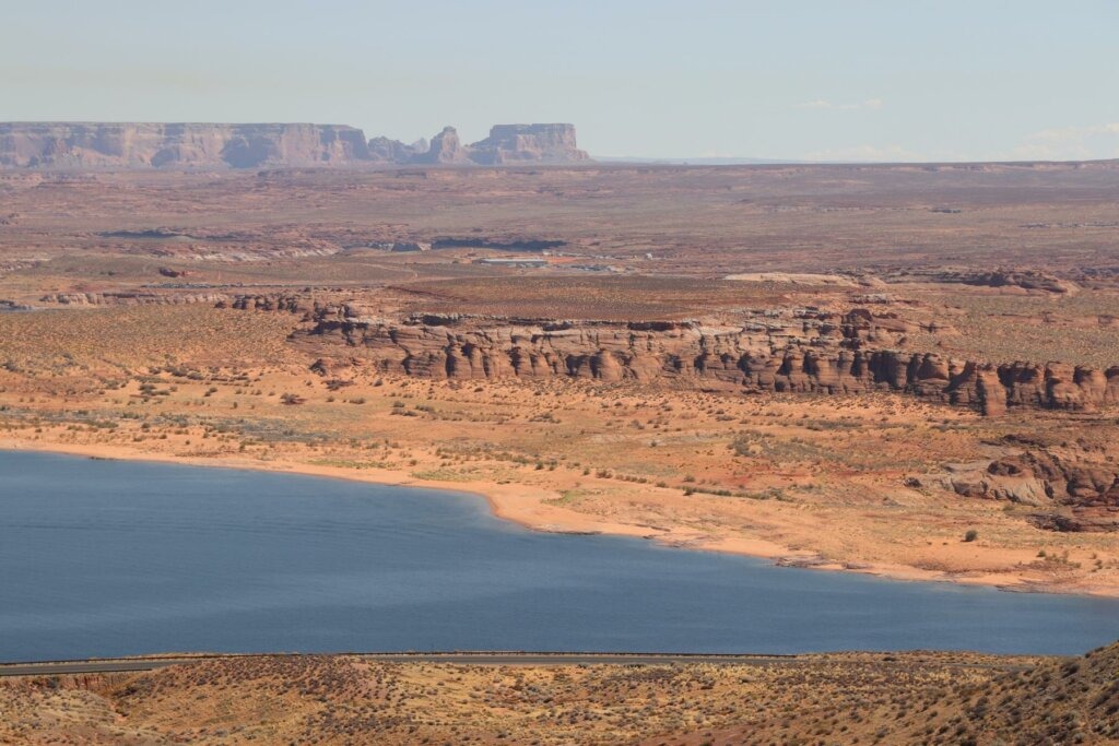 Die Landschaft zieht vorbei wie ein Film und durch die fehlende Geschwindigkeit verlieren wir unterwegs jegliches Gefühl für Ort und Zeit. Nach etwa drei Stunden Fahrt erreichen wir Page in dem Bundesstaat Arizona. Inclusive einer Stunde Zeitverschiebung. Die Zeit, die wir am Vortag verloren haben, bekommen wir nun wieder. Wir machen eine Pause, um den Lake Powell zu besichtigen. Ein Damm staut den Colorado River und hat damit für die Überflutung eines riesigen Gebietes in dieser Wüstenlandschaft gesorgt. Daraus entstand der Lake Powell, der zweitgrößte Stausee der USA.
