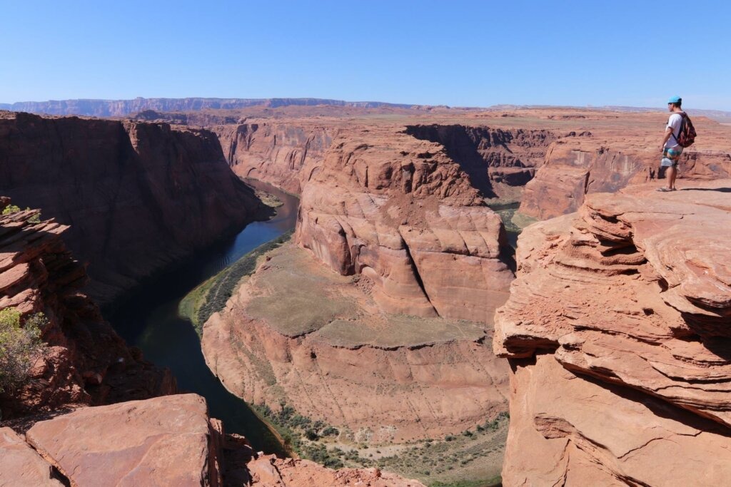 Unser Hauptziel in Page ist aber der Horseshoe Bend, eine hufeisenförmige Flussschlinge des Colorado River. Der Eintritt, um dieses Naturschauspiel sehen zu können, beträgt 10$ pro Auto. In 300 Metern Tiefe schlängelt sich hier der Colorado River durch den Canyon. Wildwest-Panorama vom Feinsten. Wir haben schon viele Bilder von dem bekannten Horseshoe Bend gesehen und ihn nun einmal live zu sehen war mehr als lohnenswert! Bei dem Anblick vergessen wir schon fast die Hitze. Zum Glück habe ich das Weitwinkelobjektiv dabei. 😉