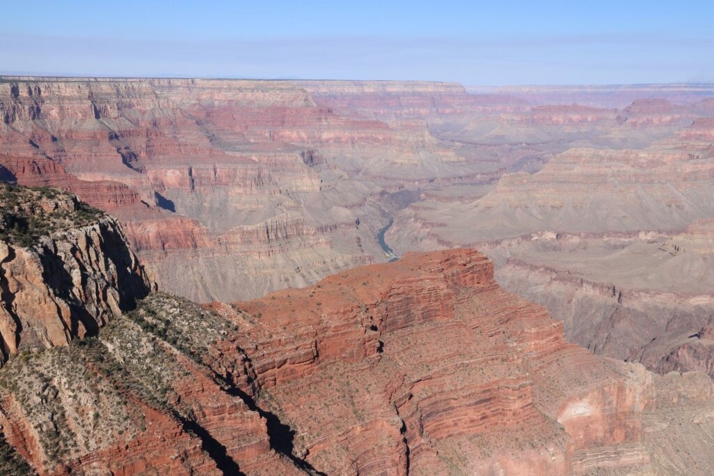 Irgendwie ein seltsames Gefühl. Wir haben schon viele Bilder von dem Grand Canyon gesehen, doch jetzt stehen wir selber hier. Bei dem Anblick in die Tiefen des Canyon fühlen wir uns sehr klein. Rund 1500 Meter geht es hier runter. Unten in der Schlucht trifft man wieder auf den Colorado River (genau wie auch am Horseshoe Bend).
