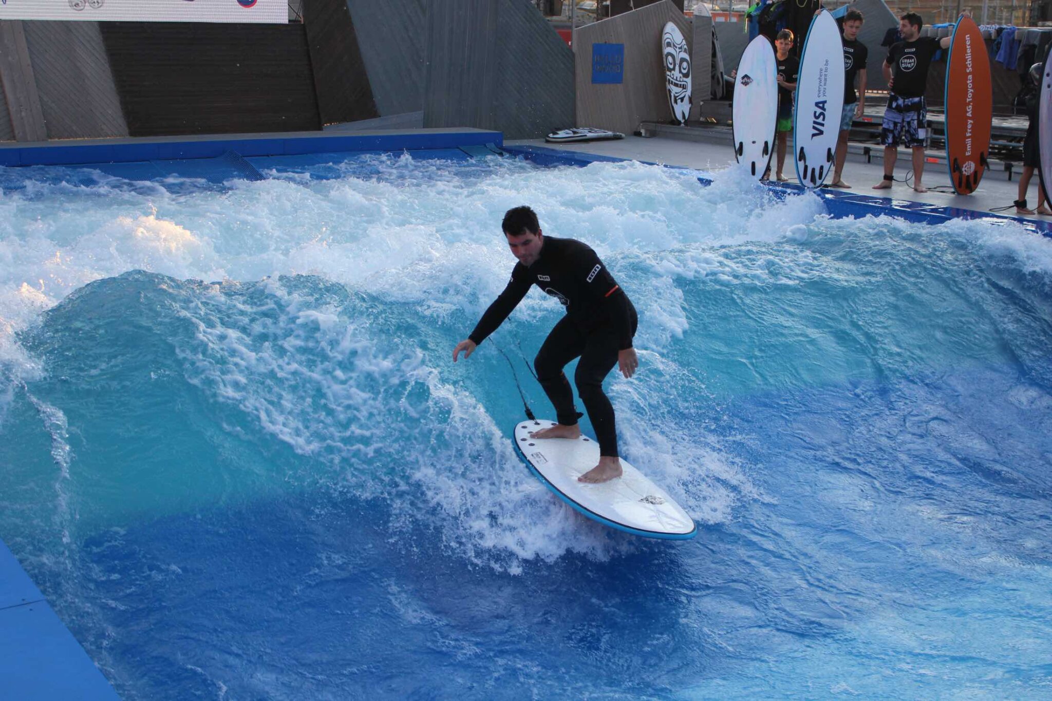 Tobi hat auf jeden Fall seinen Spaß, auch wenn das Surfen im Meer auf echten Wellen natürlich noch viel mehr Spaß macht.