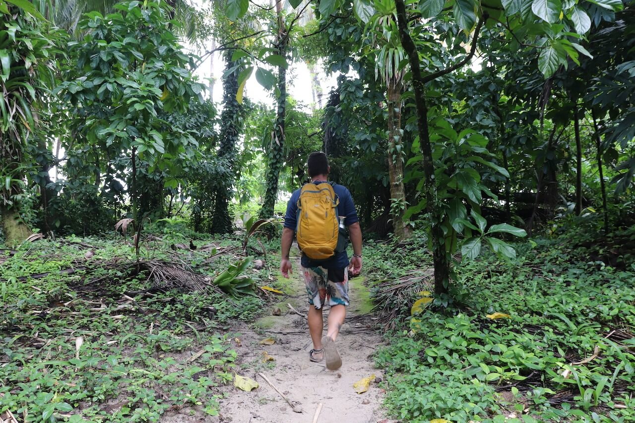 Die Insel ist von einem schönen Dschungel bewachsen und kleine Wege führen einen zu verschiedenene Stränden. Die Ostseite von der Insel ist von den Wellen nicht so gut geschützt und deswegen gehen wir zu den Stränden an der Westseite. Hier ist das Wasser schön ruhig und wir fühlen uns wirklich wie auf einer Paradiesinsel!