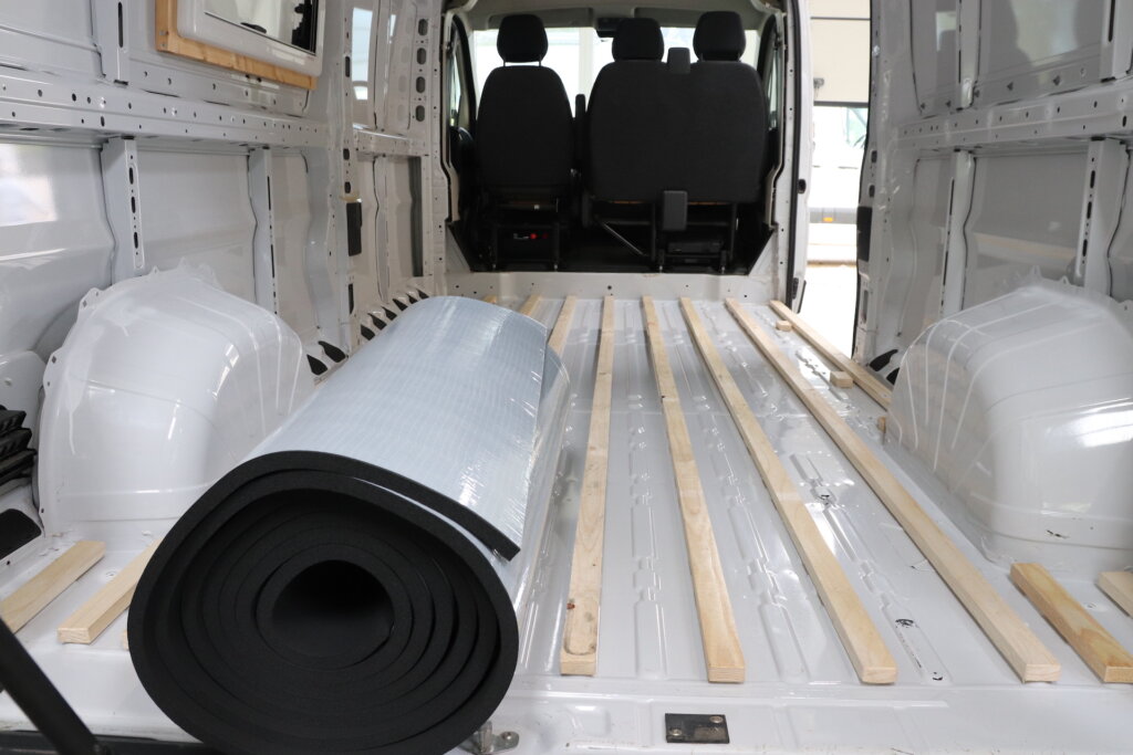 Nun kann der Boden im Camper gedämmt werden. Weil wieder etwas Dreck auf dem Boden ist machen wir noch einmal mit Silikonentferner sauber. Wir messen die Bahnen zu, schneiden das Armaflex zurecht und kleben es zwischen unsere Unterkonstruktion.