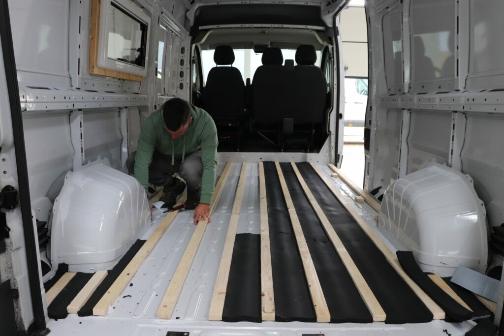 Jede Latte sitzt an der richtigen Stelle und weil dabei wieder etwas Dreck entstanden ist, machen wir den Boden fix nochmal mit Silikonentferner sauber und kleben anschließend wir die Unterkonstruktionslatten mit Sikaflex 252i* auf den Boden. Da wir in den Fahrzeugboden keine Schrauben reinbohren möchten benutzen wir Sikaflex. Damit der Kleber gut hält beschweren wir die Latten mit viel Gewicht und lassen es über Nacht trocknen. Am nächsten Morgen sitzt alles bombenfest.