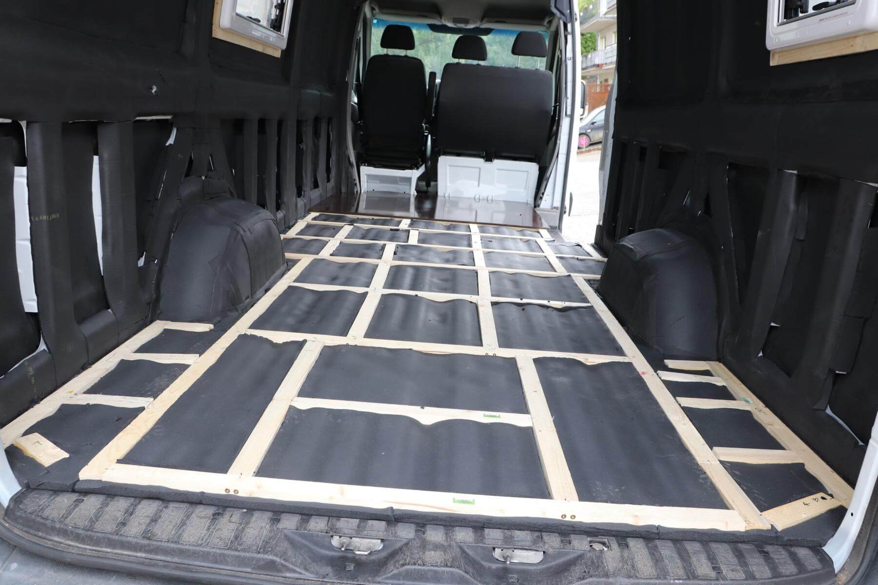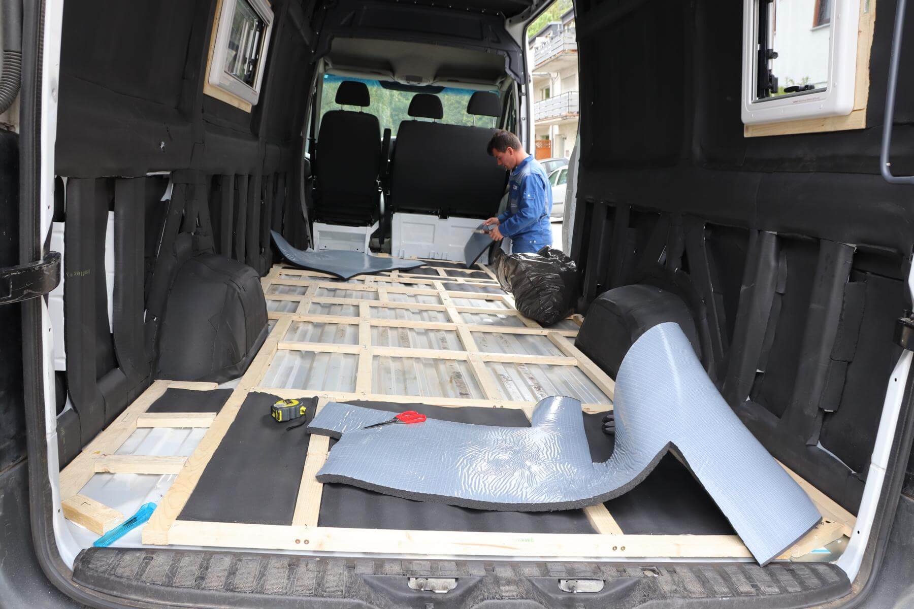 Zunächst haben wir eine Unterbodenkonstruktion angefertigt, die unter die neue Bodenplatte kommen soll. Damit die Bodenplatte nicht nachgeben kann, haben wir sowohl Längs-, als auch Querverbindungen gelegt. Die Höhe der Holzleisten sollte höher sein als das 19 mm verlegte Armaflex*. Das hilft dabei das Material vor dem Zerdrücken zu schützen, damit es seine Eigenschaften zum Dämmen behält. Unser Boden vom Sprinter ist gewellt, weswegen wir zwei verschiedene Holzstärken verwenden. Einmal 24 mm für den geriffelten Boden und einmal 28 mm für die Rillen. Die „Wellen“ sind 5mm hoch, so gleicht es sich bis auf einen Millimeter aus.
