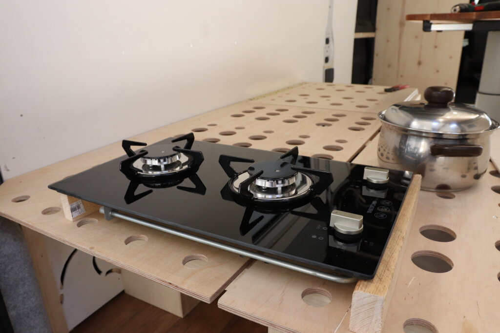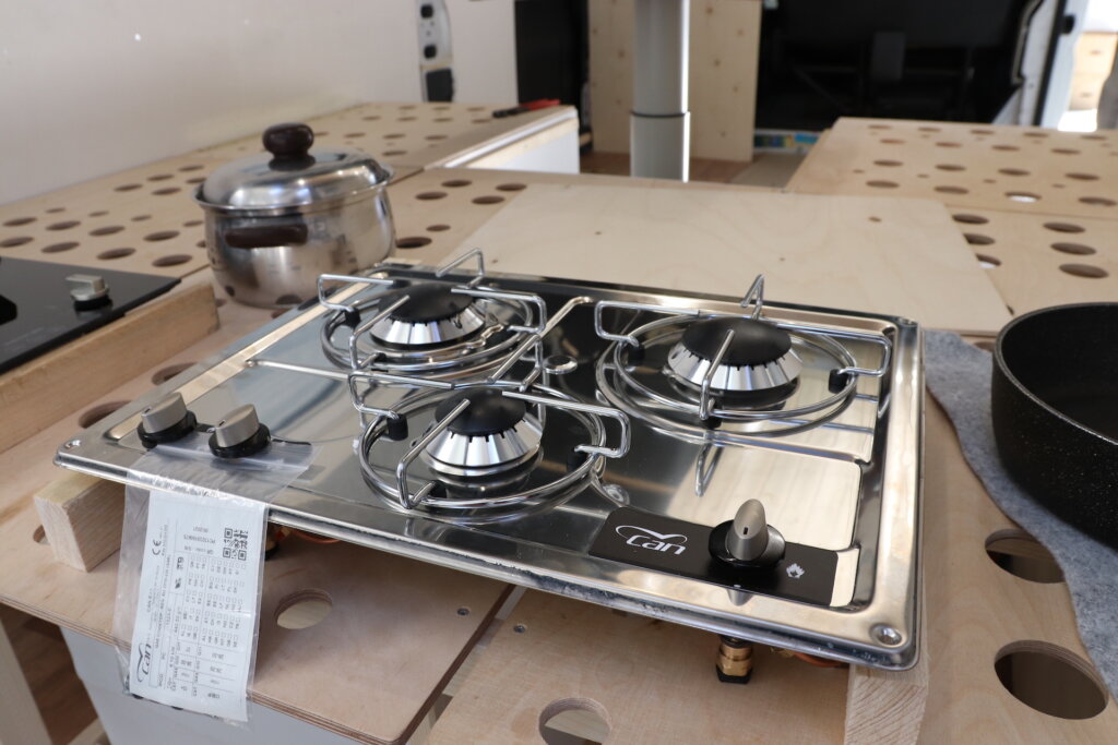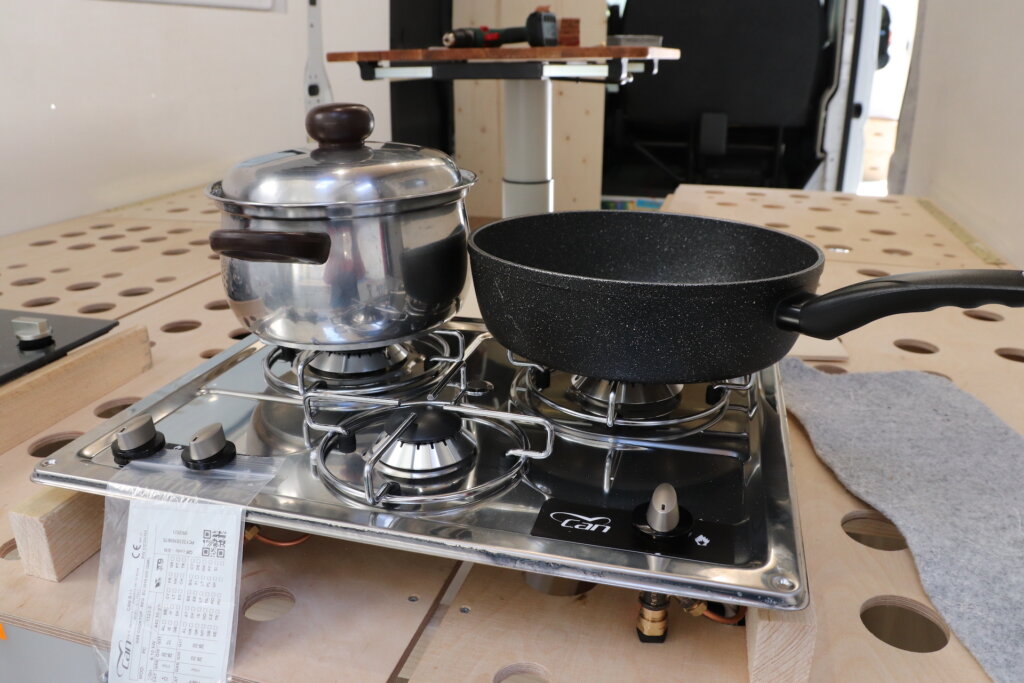 Wir lieben es unterwegs zu kochen und so darf für uns ein großes Gaskochfeld nicht fehlen. Tatsächlich gibt es gar nicht so viel Auswahl an Gaskochfeldern mit zwei oder drei Flammen, die zum einen eine vernünftige Brennerleistung haben und dennoch genügend Platz für eine große Pfanne und einen Topf bieten. Nach etwas Recherche haben wir uns für ein dreiflammiges Gaskochfeld von Can* entschieden.