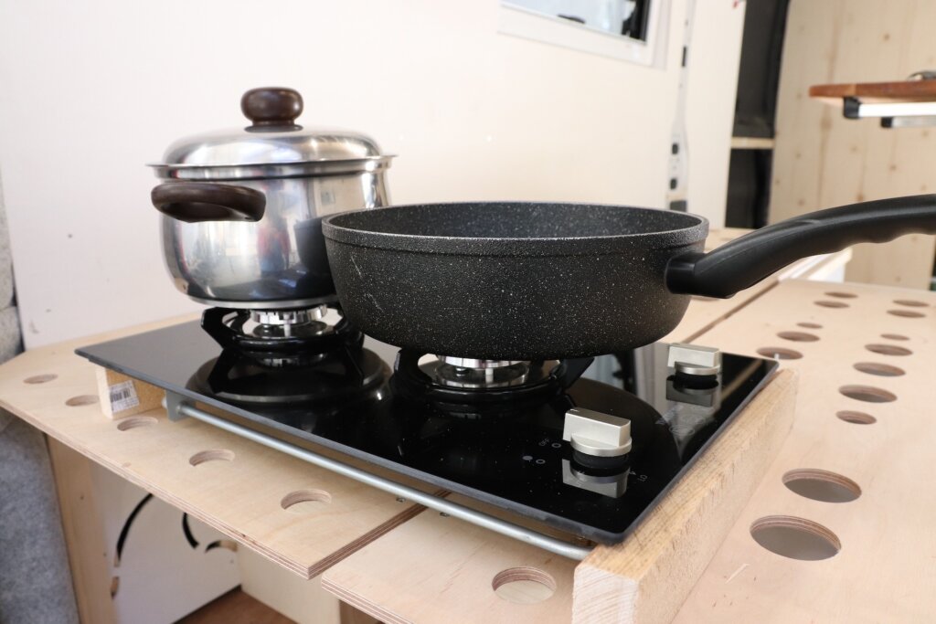 Bei unserer Suche nach einem Gaskochfeld sind wir auf das Thetford Topline 922* und das Can PC1323* gestoßen. Das Modell von Thetford sieht zwar schöner aus, allerdings ist es nicht so groß, die Bedienknöpfe sind etwas im Weg und beide Brenner haben nur eine Leistung von 1.5 kW. Auch im Größenvergleich sieht man, dass das Kochfeld von Can für eine große Pfanne sowie einen großen Topf ein besseres Platzverhältnis bietet. Um mit dem Gaskochfeld die Wohnmobil Zulassung zu erhalten, dürfen nur Produkte verwendet werden welche explizit für den Einbau in Wohnmobilen zugelassen sind. Man kann also (soweit wir wissen) nicht ein Kochfeld für den Hausgebrauch einbauen.