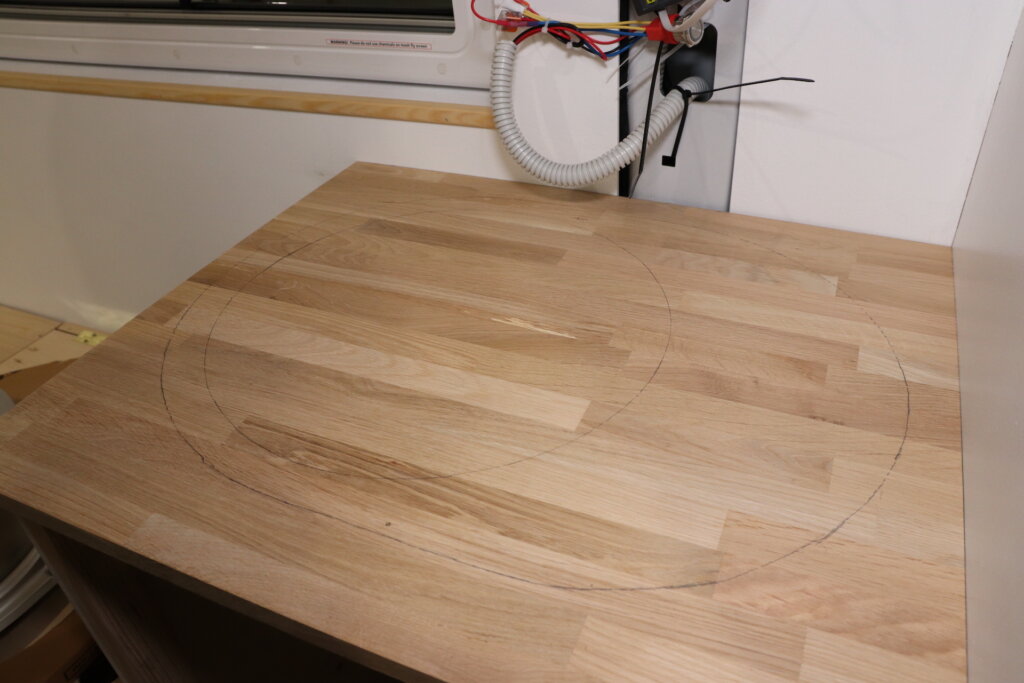 Die Küchengerüste schrauben wir in den Boden (Bodenplatte) und befestigen sie außerdem mit Schrauben und Nietmuttern, die wir vorher in die Karosserie gesetzt haben. Als Arbeitsplatte verwenden wir eine Leimholzplatte aus Eiche. Diese ist erstaunlich schwer für ihre 18 mm Stärke, aber uns gefällt die schöne braune Farbe sehr gut und da wir ansonsten recht leicht gebaut haben wird das zusätzliche Gewicht kein Problem darstellen. Außerdem ist die Platte aus Eiche ziemlich resistent gegenüber Kratzern und Dellen. Wir sägen unsere Leimholzplatte auf die richtige Größe zu und im nächsten Schritt kann auch schon das Gaskochfeld eingesetzt werden. Mithilfe der beiliegenden Schablone können wir den Ausschnitt exakt anzeichnen und sägen ihn mit der Stichsäge zu. Die Leimholzplatte behandeln wir anschließend mit zwei Schichten Arbeitsplattenöl. So wird das Holz vor Feuchtigkeit geschützt und die Farbe verwandelt sich in einen sehr schönen braunton.