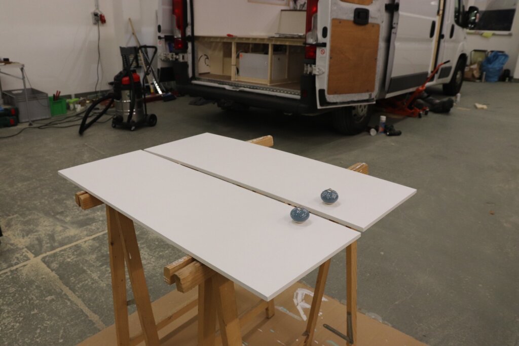 Wir möchten unsere Küche noch verschönern und etwas Farbe in unseren Van bringen. Mit weißer Vorstreichfarbe streichen wir das Holz von beiden Seiten und lassen es trocknen. Anschließend schleifen wir es mit feinem Schleifpapier und nun kann die finale Farbe drauf. Die Farbauswahl ist uns wirklich schwer gefallen. Zuerst haben wir im Baumarkt einen Buntlack in türkis gekauft und damit eine Schrankwand gestrichen. Das Ergebnis hat uns leider überhaupt nicht gefallen, viel zu grell und knallig. Glücklicherweise haben wir dann doch noch eine schöne Farbe gefunden, nämlich das Aventuringrün aus dem Bauhaus. Zwischenzeitlich waren wir schon etwas verzweifelt, weil so mancher Farbton sieht auf der Farbpalete schön aus, auf großen Flächen wirkt es dann oft zu bunt.