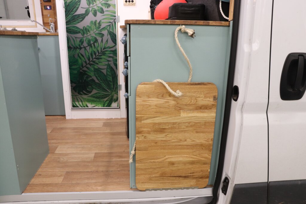 Zuerst haben wir überlegt, ob wir am Schrank mit dem Gaskocher noch eine Verlängerung für unsere Küchenzeile bauen. So das der Eingang verschlossen wird, dafür aber die beiden Küchenzeile zu einer großen Zeile verbunden werden. Aber da wir nun allemal genug Platz und Arbeitsfläche haben entscheiden wir uns lieber dafür, einen Klapptisch für außen anzubringen. Wir haben ohnehin noch Reststücke unserer Arbeitsplatte übrig und anstatt sie zu entsorgen verwerten wir sie noch für einen kleinen Tisch. Mit einem Scharnier befestigen wir diese unten am Boden und um den Tisch aufzuklappen verwenden wir ein Seil, welches an der Oberseite befestigt ist.