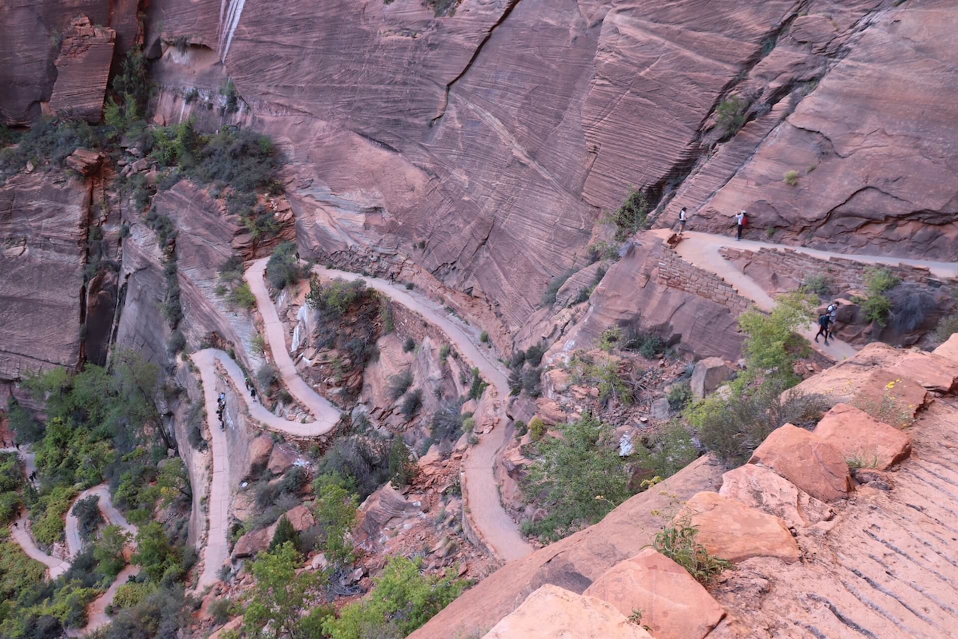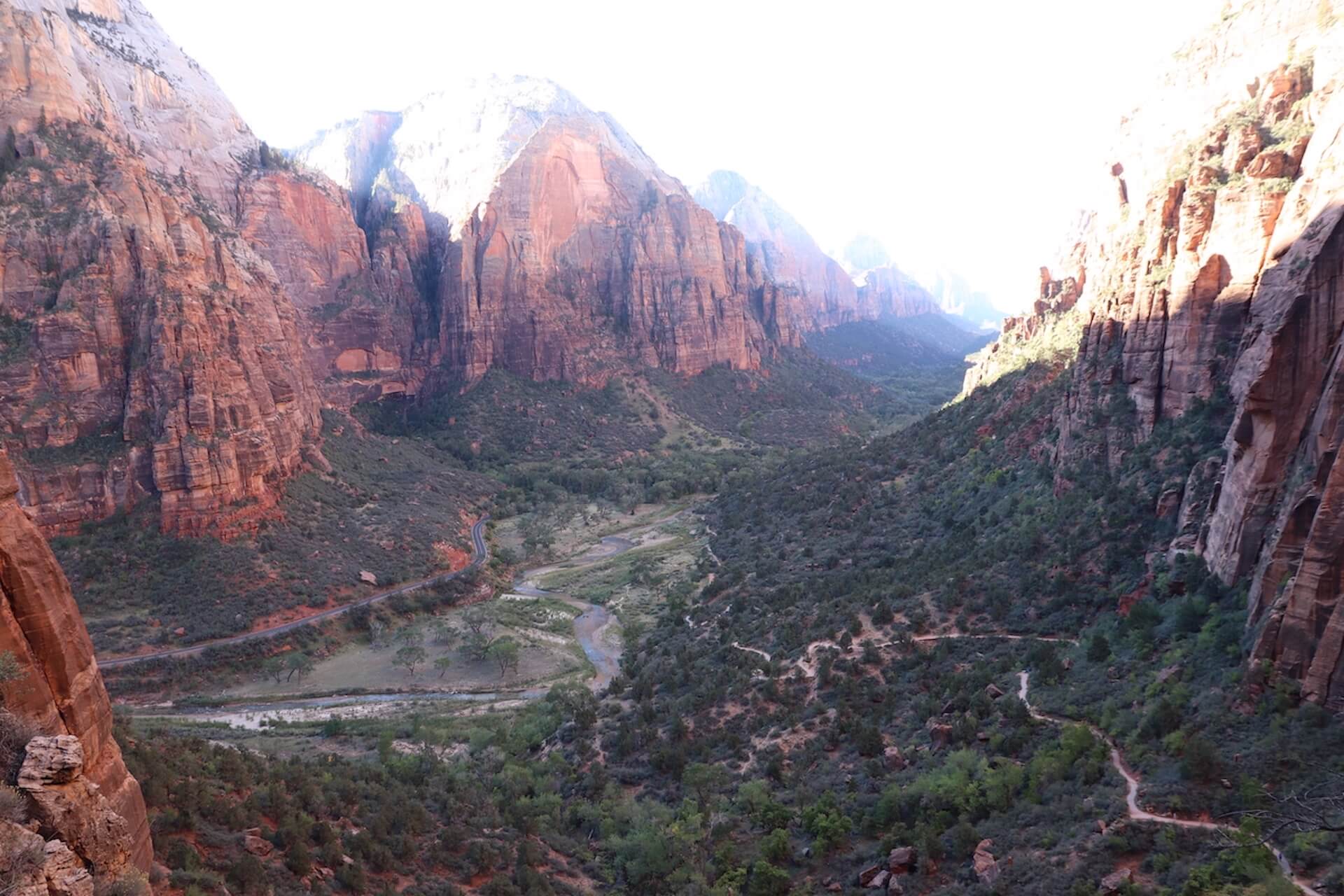 Nach der Wanderung fahren wir noch mit dem Bus zu der letzten Station, von wo aus die bekannte Wanderung ‚the narrows‘ durch die enge Schlucht startet. Unzählige Menschen laufen bewaffnet mit Stöckern und Wasserschuhen in die Schlucht hinein, es sieht etwas nach einem Massenevent aus. Uns werden es hier zu viele Leute und wir fahren mit dem Bus zurück zu unserem Auto. Auf dem Weg raus stoppen wir noch bei dem ‚Canyon overlook trail‘, wo wir nach etwas Wartezeit noch einen freien Parkplatz bekommen. Nach einem kurzen Spaziergang werden wir nochmal mit einer spektakulären Aussicht über den Zion Nationalpark belohnt und fahren weiter.