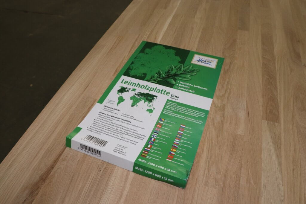 Als Arbeitsplatte haben wir uns für eine schöne 18 mm starke Leimholzplatte aus Eiche entschieden. Diese hat eine sehr schöne Farbe, ist robust und stabil und dank der glatten Oberfläche lässt sie sich gut abwischen. Auch unsere Tischplatte besteht aus dieser Leimholzplatte. Das Holz haben wir noch mit einem Arbeitsplattenöl gestrichen. So ist die Leimholzplatte widerstandsfähiger und bekommt nicht so schnell Flecken, da es sich schon mit dem Öl vollgesaugt hat.