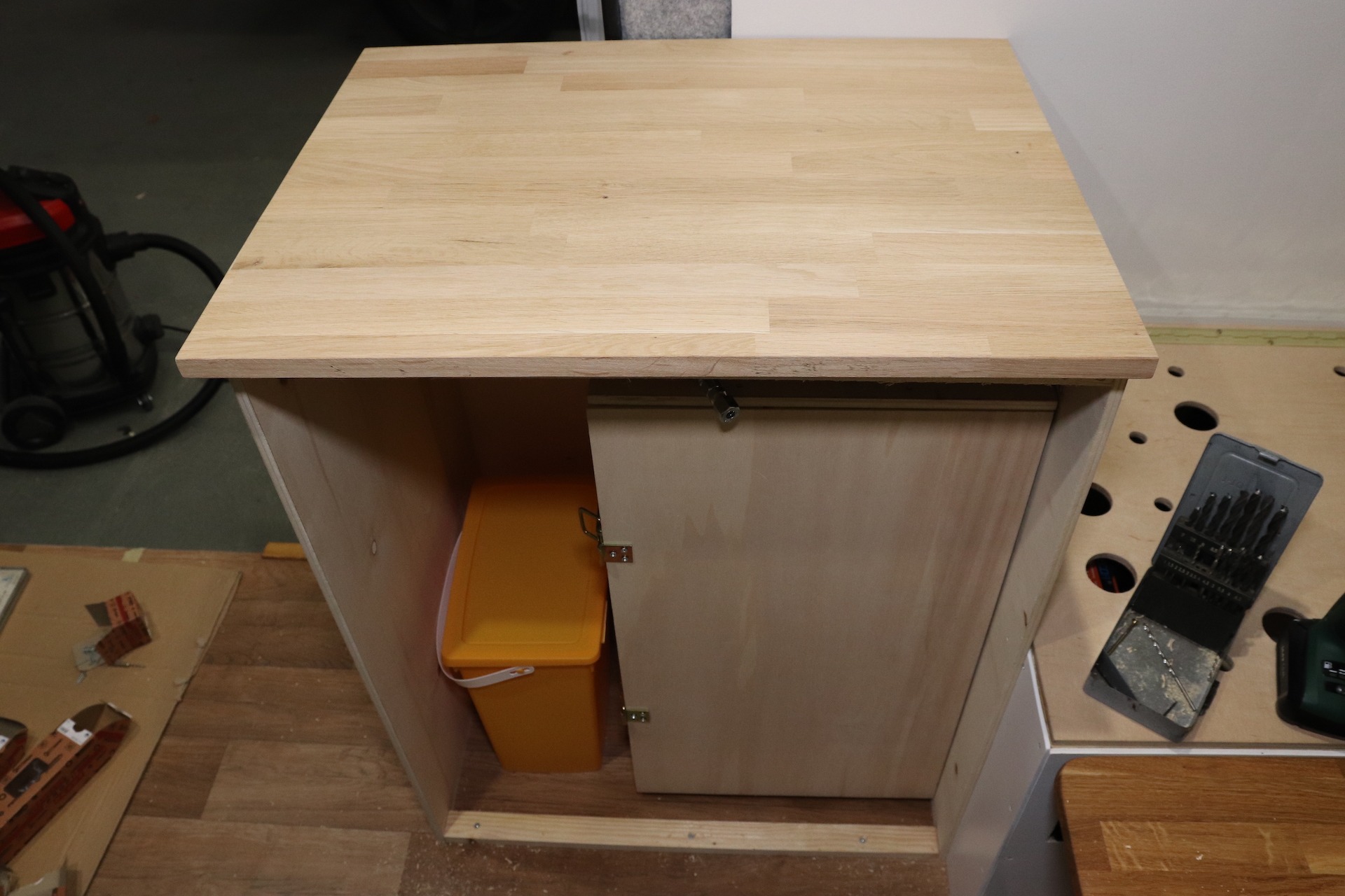 Als Arbeitsplatte haben wir uns für eine schöne 18 mm starke Leimholzplatte aus Eiche entschieden. Diese hat eine sehr schöne Farbe, ist robust und stabil und dank der glatten Oberfläche lässt sie sich gut abwischen. Auch unsere Tischplatte besteht aus dieser Leimholzplatte. Das Holz haben wir noch mit einem Arbeitsplattenöl gestrichen. So ist die Leimholzplatte widerstandsfähiger und bekommt nicht so schnell Flecken, da es sich schon mit dem Öl vollgesaugt hat.