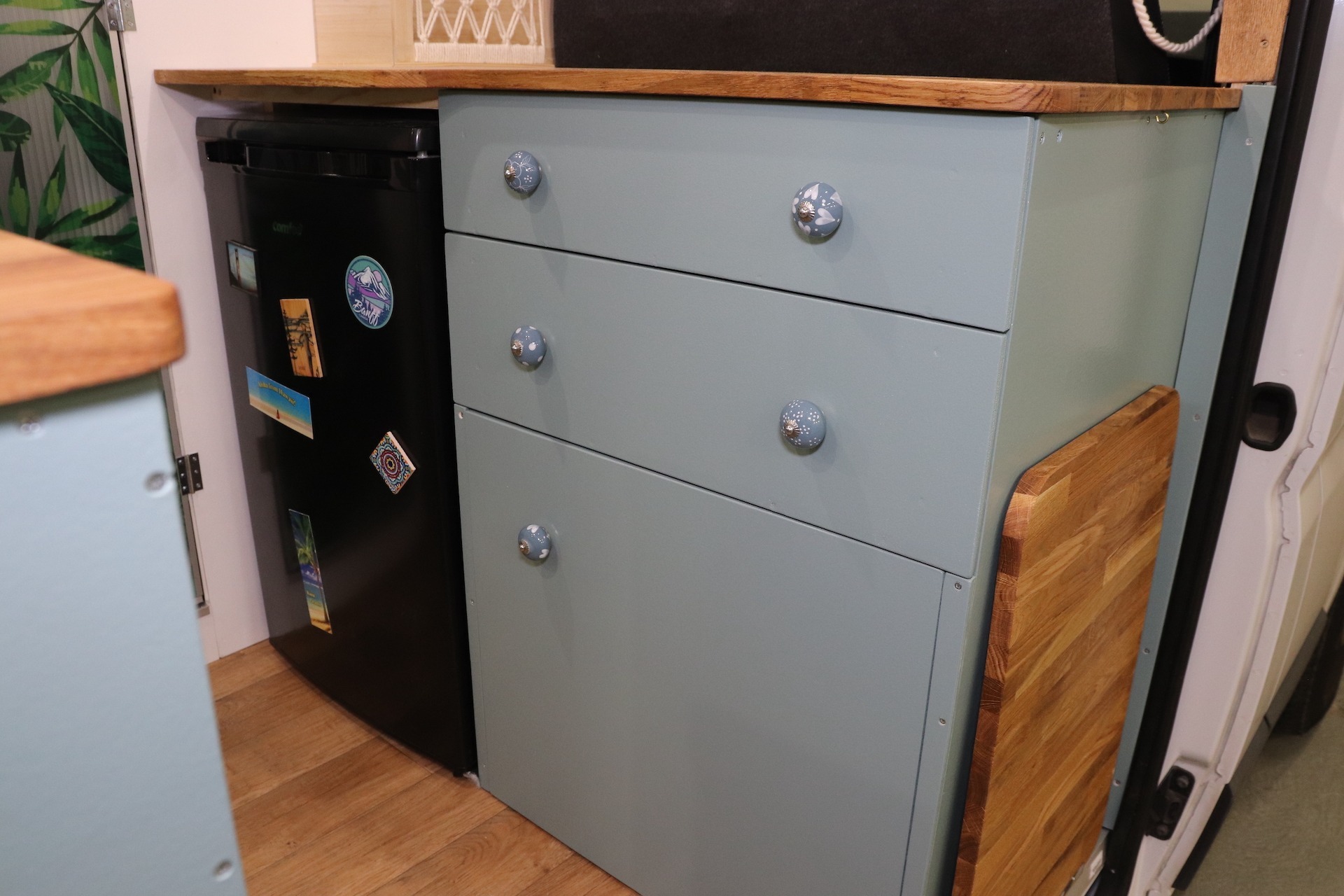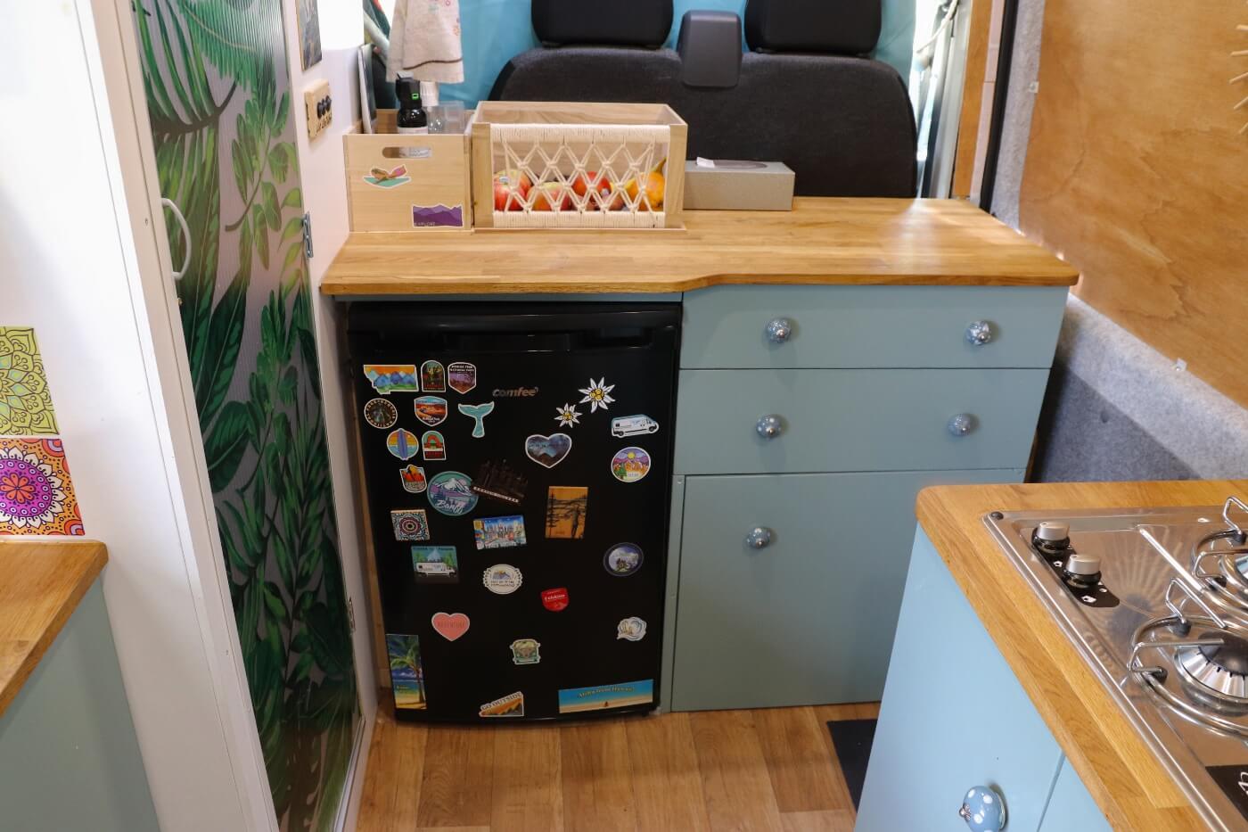 Die Küche, die Hängeschränke und auch die Dusche haben wir aus Pappelsperrholz gebaut. Dieses ist günstig und leicht und in verschiedenen Stärken erhältlich. Allerdings ist es auch weich und somit eher anfällig für Macken und Kratzer.