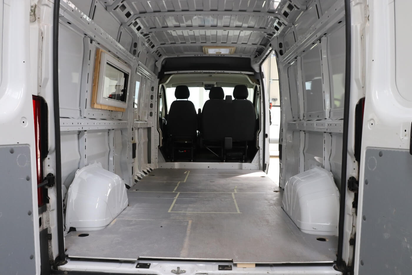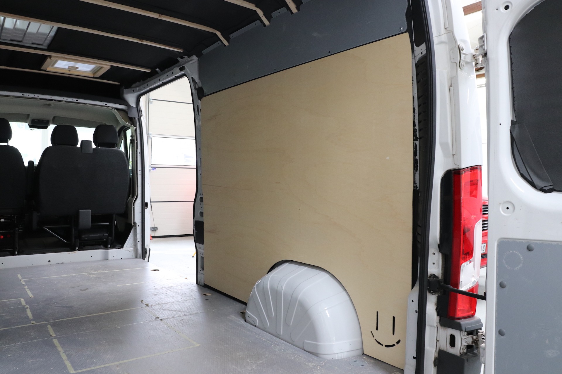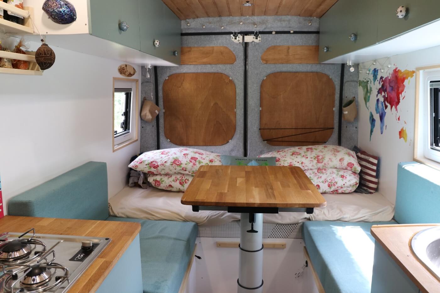 Die Schiebetür und die Hecktüren haben wir mit Filz verkleidet. Zusätzlich dazu haben wir noch 4 mm Pappelsperrholz angebracht und dieses mit Osmo Hartwachsöl in Bernstein gestrichen. So passen die Türen perfekt zu unserem gesamten Farbkonzept und wir sind sehr zufrieden mit dem Ergebnis.