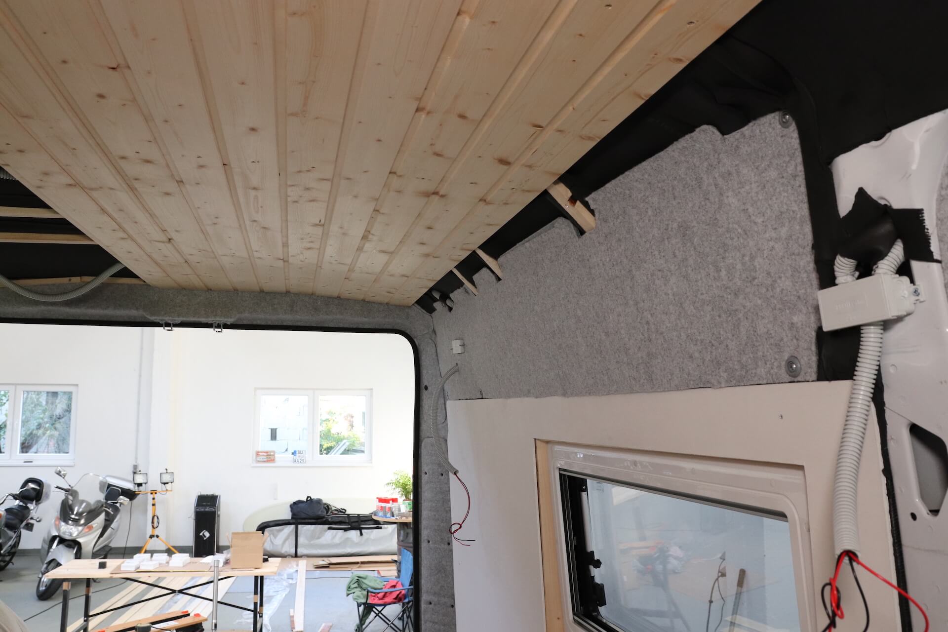 Bei der Deckenverkleidung haben wir uns für Profilholz aus Fichte entschieden, auch Nut und Feder Holz genannt. Profilholz lässt sich dank des Nut und Feder Systems leicht verlegen und auch relativ gut an die Wölbung des Camper anpassen. Profilholz ist relativ schwer, aber uns gefällt es optisch sehr gut und da wir den Rest eher leicht gebaut haben, ist das Gewicht für unseren Ausbau kein Problem. Durch die einzelnen Hölzer kann man es zudem an den Rundungen des Fahrzeuges angleichen. Weitere Optionen für die Deckenverkleidung sind Sperrholzplatten aus Pappel, spezielles Biegesperrholz oder Akustikpanele.