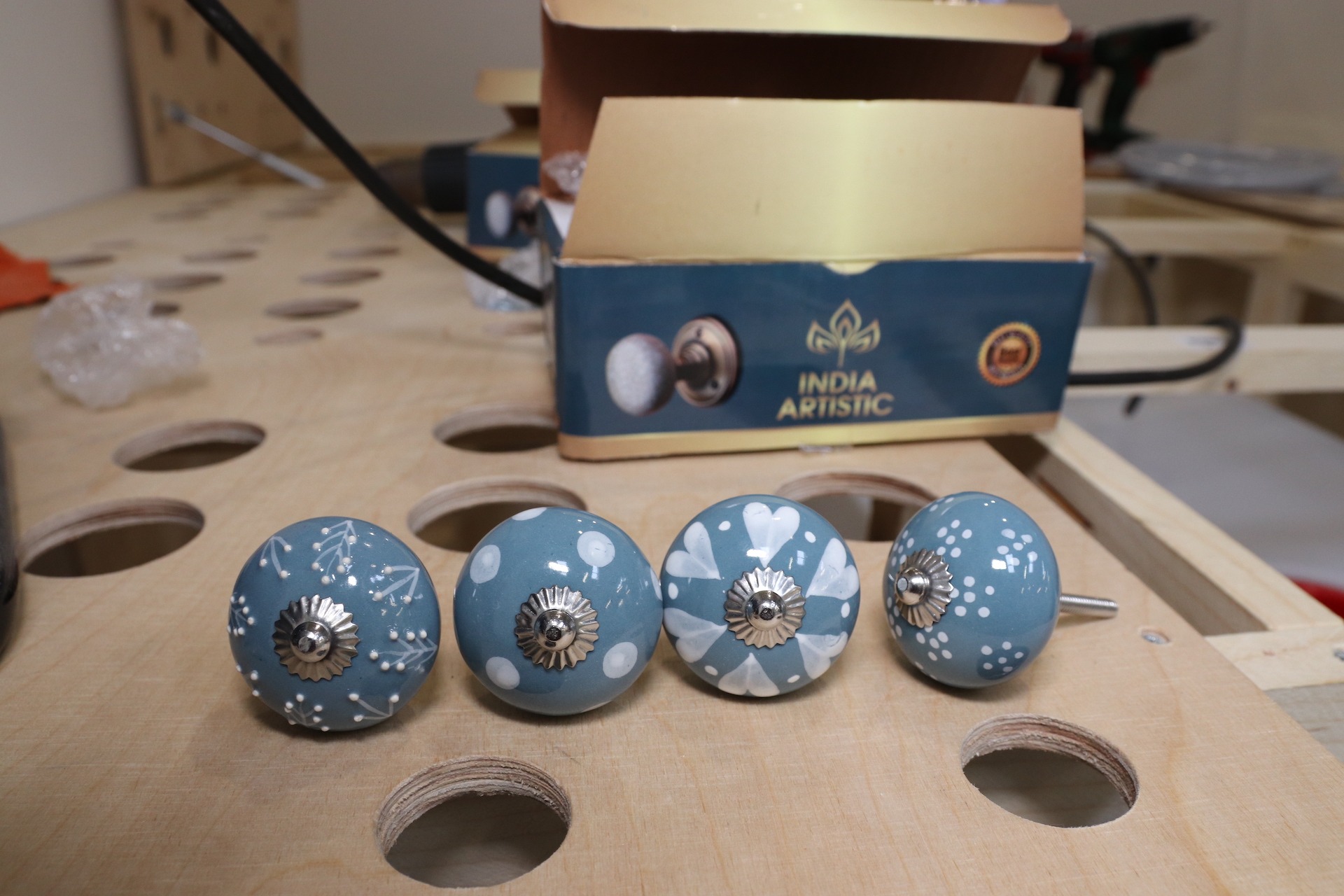 An unseren Küchenschränke und den Hängeschränke haben wir Möbelknöpfe* angebracht. So kann man ganz einfach Schubalden und Schranktüren öffnen und dazu sehen sie auch noch richtig hübsch aus und passen farblich perfekt zu unseren Möbeln. Falls du dich jetzt fragst welche Farbe das ist: wir haben unsere Küchenschränke und die Hängeschränke in Aventuringrün gestrichen. Diese Farbe stammt aus der schöner Wohnen Kollektion vom Bauhaus und dort kannst du dir die Farbe mischen lassen.