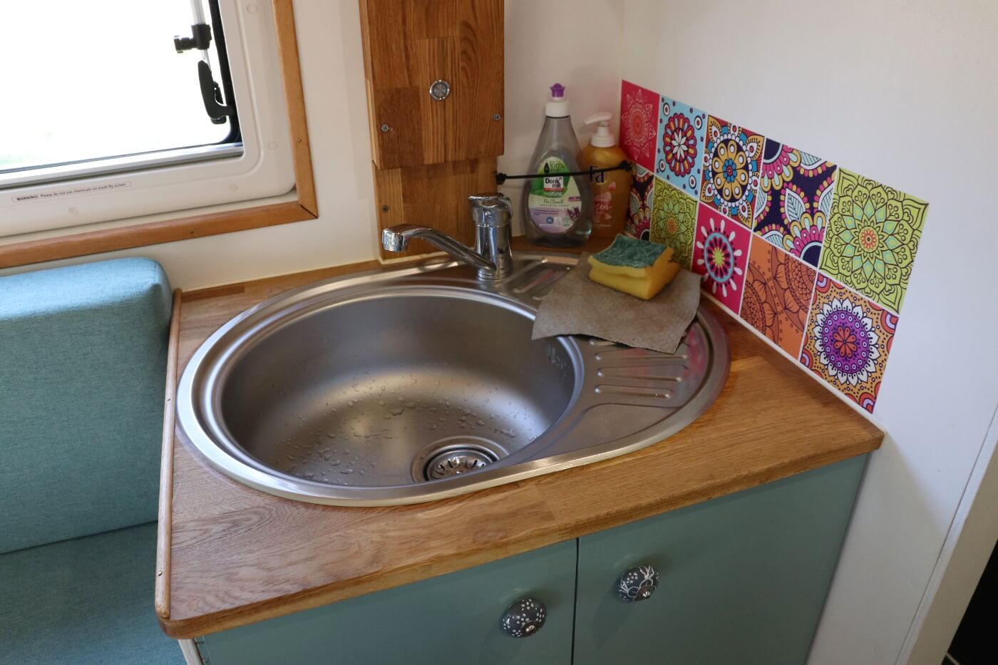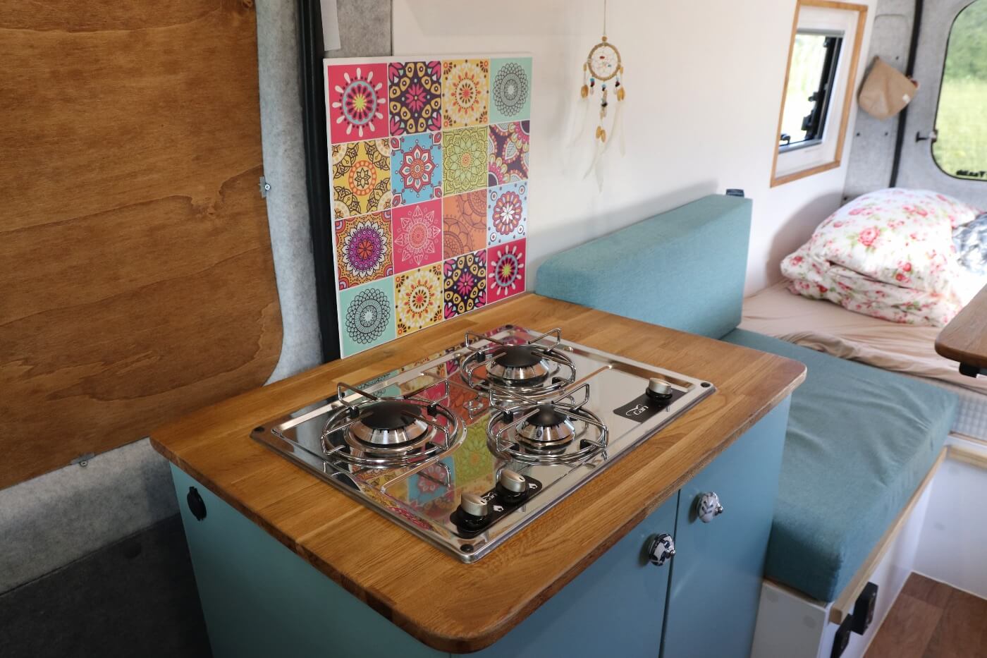 In unserer Campervan Küche haben wir diese schönen Klebefliesen* angebracht. Eigentlich dienen sie als Spritzschutz für unser Gaskochfeld*. Weil wir sie aber so schön finden, haben wir sie auch in unserer restlichen Küche verteilt sowie auf der Schubladenfront von dem Podest der Sitzecke. Die Klebefliesen lassen sich total einfach anbringen und auch wieder abziehen. Achte aber unbedingt auf eine gute Qualität, sonst halten die Klebefliesen nämlich nicht lange an der Wand und lösen sich wieder. Wir haben unsere Klebefliesen bei Etsy gekauft und sind mit der Qualität sehr zufrieden.