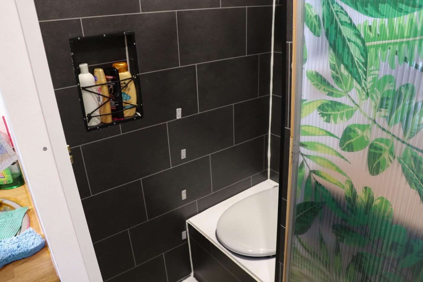 In unserem Bad haben wir einen Handtuchhalter installiert, der gleichzeitig auch Stauraum bietet. Unsere großen Duschhandtücher hängen wir hier zwar nicht auf, aber für ein kleines Handtuch ist es ausreichend und zugleich lagern wir dort auch das Streu für unsere Trockentrenntoilette.