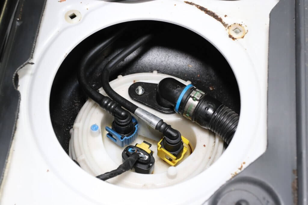 Der Zugang dazu befindet sich unter der Doppelsitzbank. Wir lösen die Schrauben von der Doppelsitzbank und schieben sie anschließend ein Stück nach vorne. Alternativ kann man sie natürlich auch raustragen. Danach entfernen wir die kleinen Abdeckung im Boden des Fahrerhauses über dem Dieseltank. Darunter sitzt nun der Tankgeber mit den dazugehörigen Leitungen. Hier finden wir auch die Tankentlüftung angeschlossen, welche wir mit zwei Schrauben lösen und abziehen können.