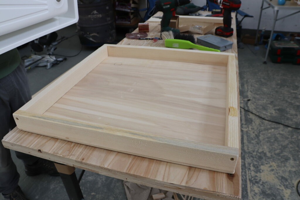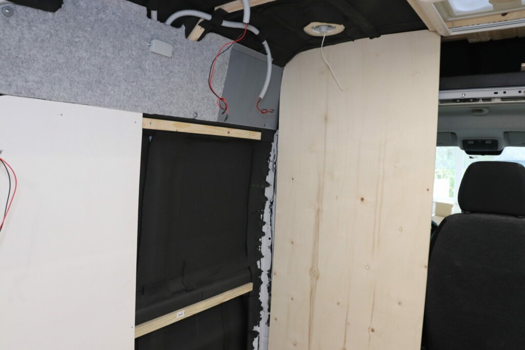 Die linke Seitenwand unserer Nasszelle wird sich neben unserer Küchenzeile befinden und wird später auch daran befestigt. Zusätzlich werden wir sie aber auch in unsere Rückwand sowie an die Unterkonstruktion an der Fahrzeugwand verschrauben.