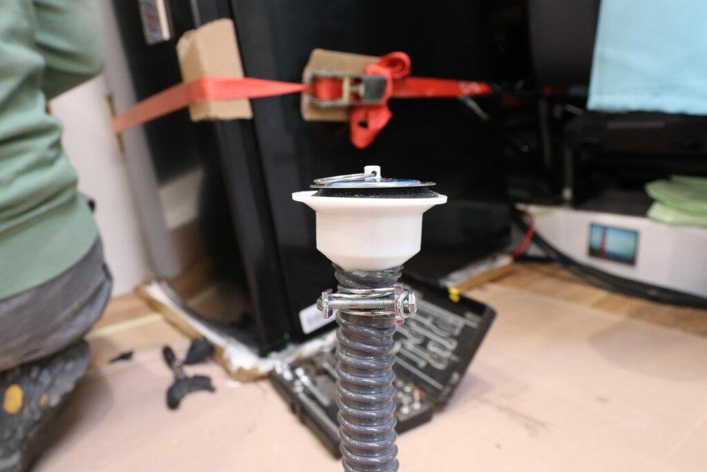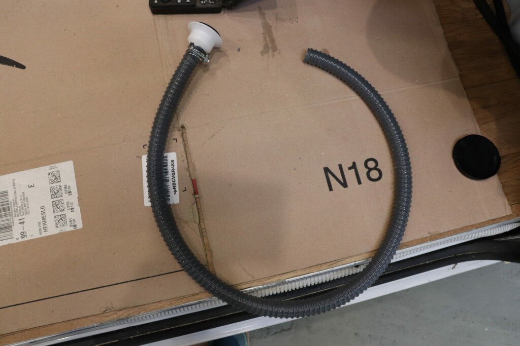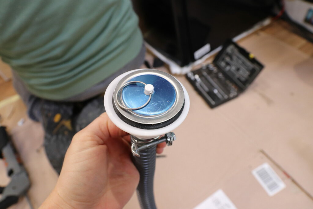 An der Ablaufgarnitur befestigen wir einen 19 mm großen Schlauch, welchen wir mit einer Klemme an dieser befestigen. Danach bohren wir mit der Bohrmaschine und einem Kronenbohrer das Loch im Fahrzeug von oben bis nach unten, also durch die Bodenplatte und den Fahrzeugboden hindurch, so dass wir unter dem Auto herauskommen. Das Loch dichten wir zu den Rändern mit Sikaflex 252i* ab. Die Ablaufgarnitur setzen wir mit Sikaflex in unserer Duschwanne ein und schieben den Schlauch vorsichtig durch das Loch, so dass dieser unter dem Auto wieder rauskommt. Da der Abfluss nicht mittels Schrauben oder ähnlichem fixiert werden kann, kleben wir diesen ein. Daran können wir dann später unter dem Fahrzeug unsere Leitung bis zum Abwassertank legen.