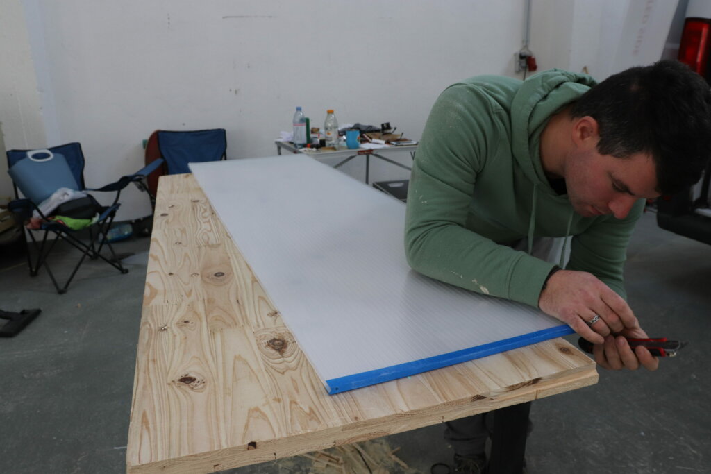 Die Türöffnung hat keineswegs ein gängiges Maß und so ist es gar nicht so einfach eine passende und wasserdichte Duschtür für unseren Van zu finden. Deswegen möchten wir unsere Duschtür wie auch in unserem Sprinter wieder aus einer 10 mm Hohlkammerplatte selber bauen.