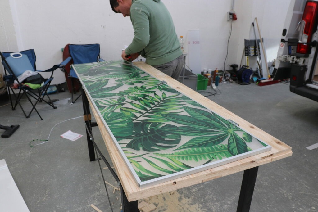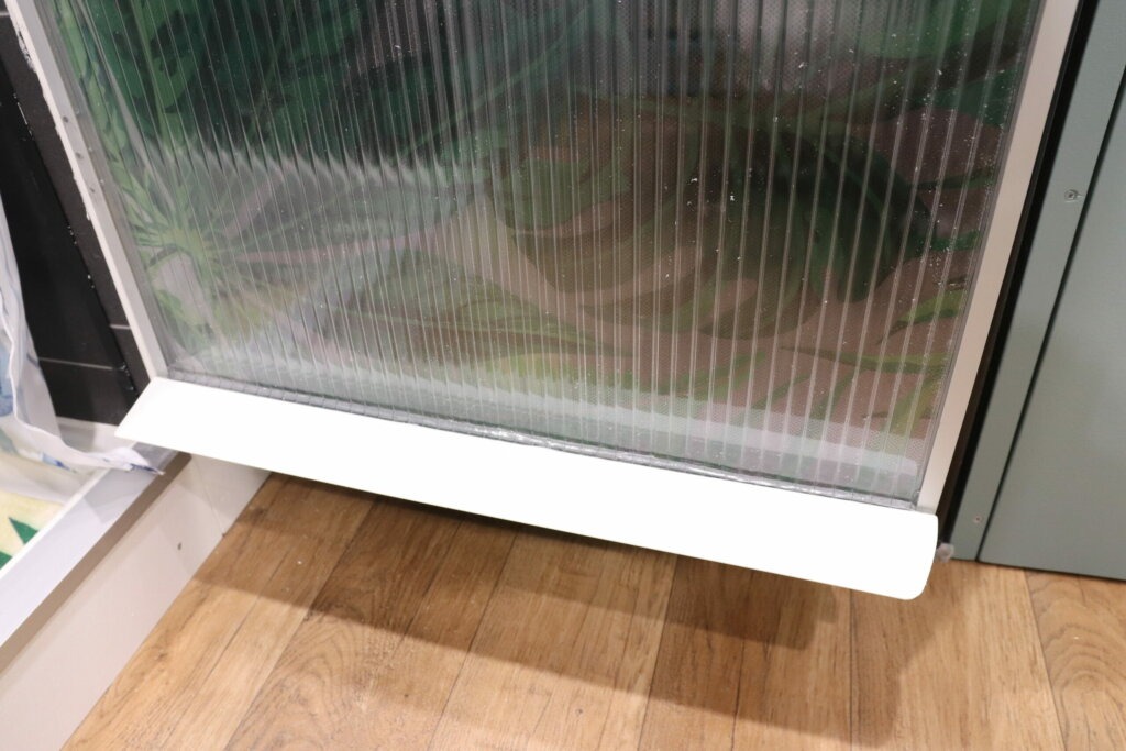Wir sägen die Hohlkammerplatte auf das Maß für die Tür zu und stecken dann die 10 mm Aluschiene drauf. Anschließend befestigen wir drei Scharniere an der Tür sowie an unserer Außenseite der Dusche. So durchsichtig soll die Tür natürlich nicht bleiben. Wir haben eine schöne Fensterfolie gefunden, die unsere Duschtür verschönern soll und sie blickdicht macht.