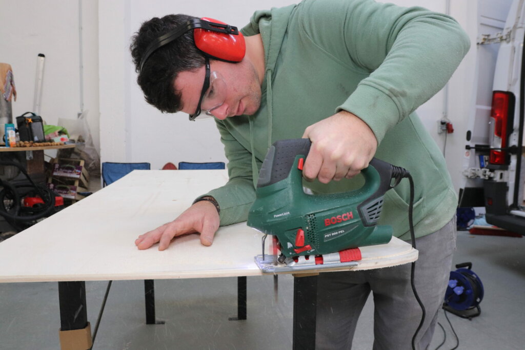 Die Befestigungspunkte vorne haben wir, nun muss die Pappelsperrholzplatte an alle Kanten und Rundungen des Fahrzeugs angepasst werden. Das erfordert einiges an Geduld, immer wieder müssen wir neu anzeichnen und tasten uns langsam heran.