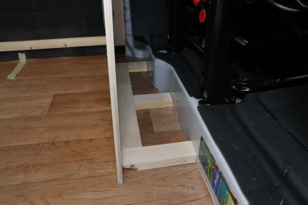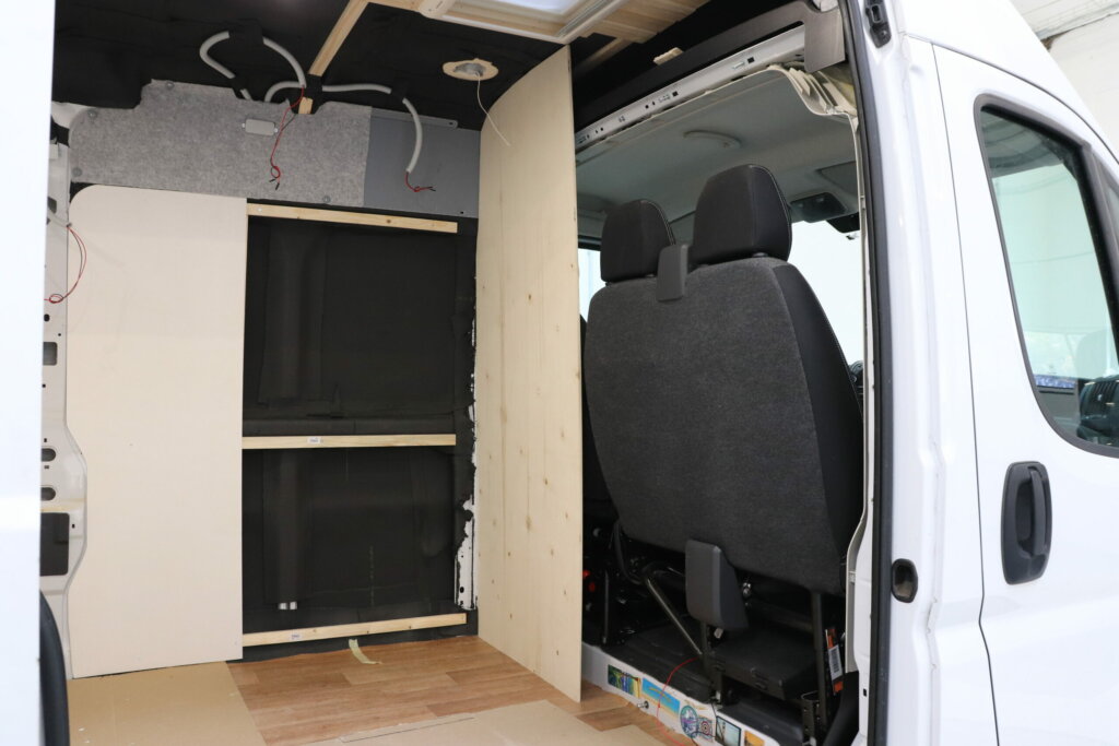 Die rechte Seitenwand hinter dem Fahrersitz muss gut gesichert und befestigt werden und bis jetzt fehlt es uns dafür an Befestigungspunkten. Wir stellen unsere grob zugeschnittene Seitenwand hinter den Fahrersitz und schauen, wie viel Abstand wir vom Fahrersitz zur Duschwand benötigen und wie wir unsere Seitenwand befestigen können. Auch wenn wir erstmal nicht planen unseren Van in naher Zukunft zu verkaufen, sollte auch jemand Größeres genug Platz hinter dem Steuer haben. Hinter dem Fahrersitz bauen wir ein kleines Gerüst aus Holzlatten, welches wir mittels Nietmuttern in die Karosserie hinter den Sitzen befestigen.