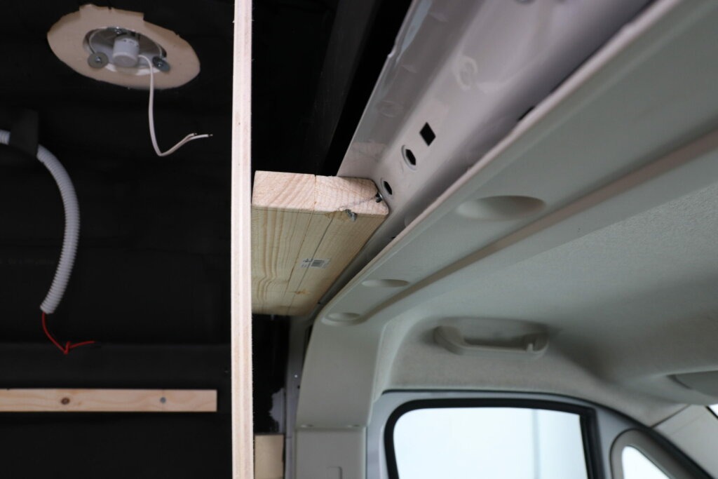 Unter dem Ablagefach von unserem Ducato ist ein kleiner Holm, in welchem die Trennwand befestigt war. Die Nietmuttern der Trennwand können wir prima für die Befestigung der Unterkonstruktion verwenden. Auch hier bauen wir uns aus mehreren Holzlatten ein Gerüst zusammen, so dass wir auf den benötigten Abstand kommen. Es ist nicht ganz einfach den schrägen Holm auszugleichen, aber nach einiger Anpassungsarbeit sieht es dann ganz gut aus. Auch diese Latten befestigen wir mit Nietmuttern in der Karosserie und haben so eine gute Auflagefläche für die rechte Seitenwand.