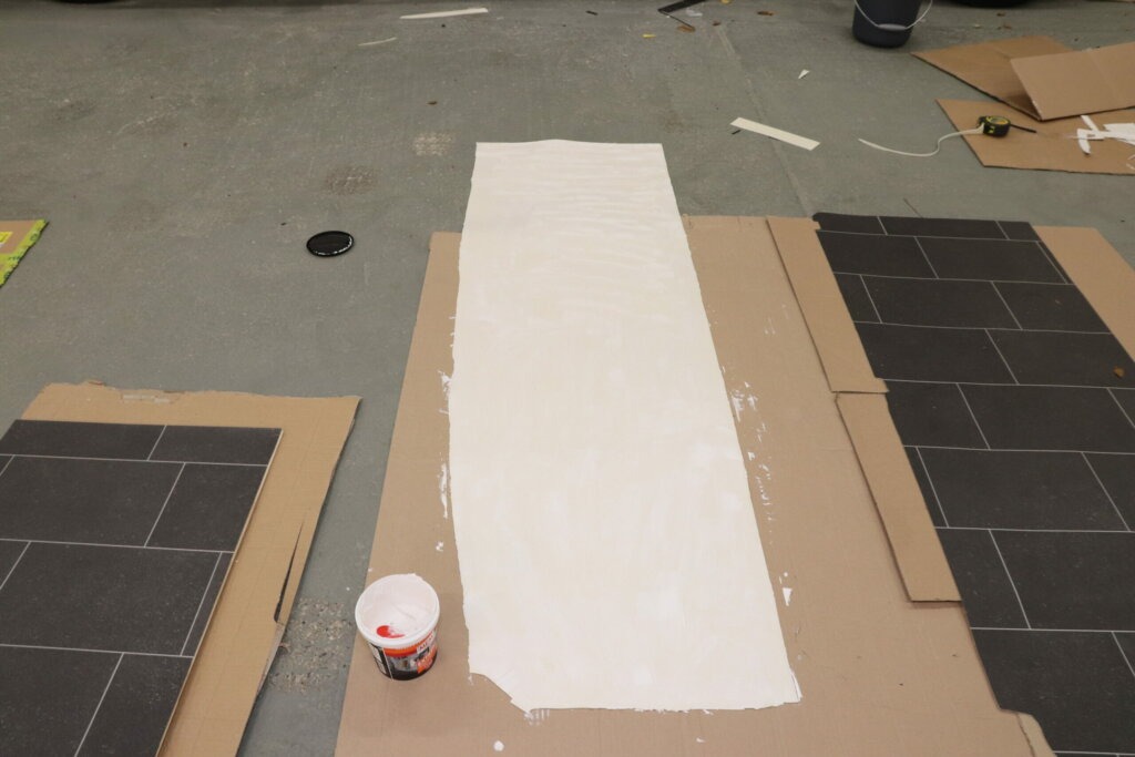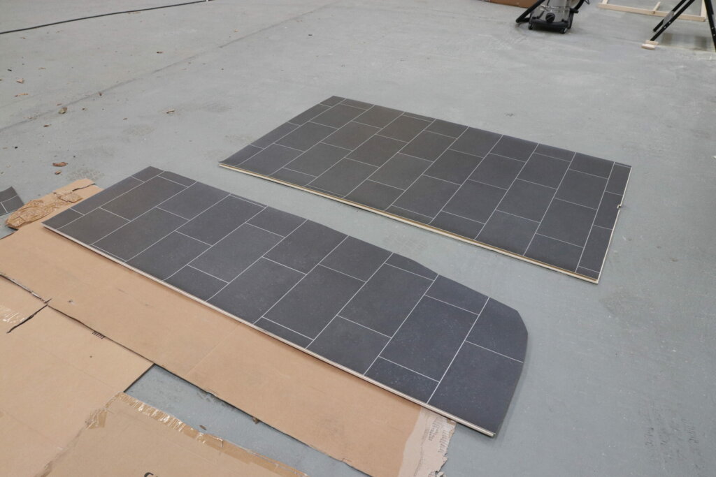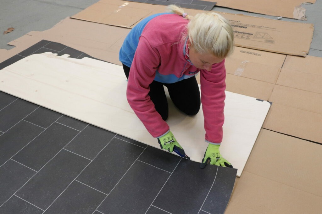 PVC Bodenbelag haben wir schon in unserem Sprinter verwendet und waren damit wirklich sehr zufrieden. PVC Boden lässt sich einfach verarbeiten und zuschneiden, ist wasserfest, vor allem günstig und es gibt ihn in vielen verschiedenen Designs. Wir breiten den PVC Boden in der Halle auf dem Boden aus und legen die bereits zugesägten Pappelsperrholzplatten darauf. So haben wir schon mal eine Schablone und müssen später nur noch ein bisschen anpassen. Mit einem scharfen Cutter Messer schneiden wir das PVC auf das richtige Maß zu. Dabei achten wir darauf, dass die Kacheln stets an auf der gleichen Höhe sein werden und es in der Dusche dann schön symmetrisch aussehen wird.