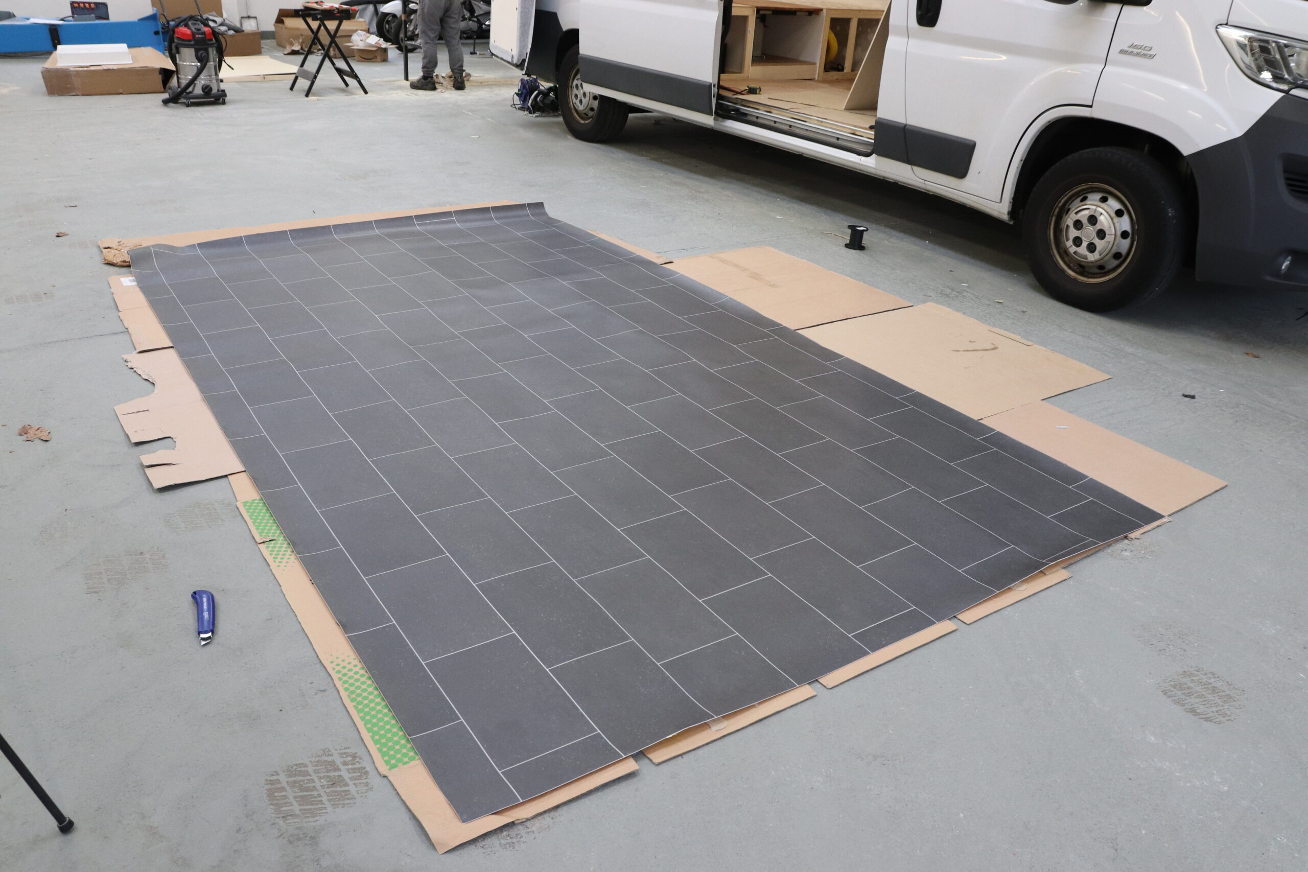 PVC Bodenbelag haben wir schon in unserem Sprinter verwendet und waren damit wirklich sehr zufrieden. PVC Boden lässt sich einfach verarbeiten und zuschneiden, ist wasserfest, vor allem günstig und es gibt ihn in vielen verschiedenen Designs. Wir breiten den PVC Boden in der Halle auf dem Boden aus und legen die bereits zugesägten Pappelsperrholzplatten darauf. So haben wir schon mal eine Schablone und müssen später nur noch ein bisschen anpassen. Mit einem scharfen Cutter Messer schneiden wir das PVC auf das richtige Maß zu. Dabei achten wir darauf, dass die Kacheln stets an auf der gleichen Höhe sein werden und es in der Dusche dann schön symmetrisch aussehen wird.