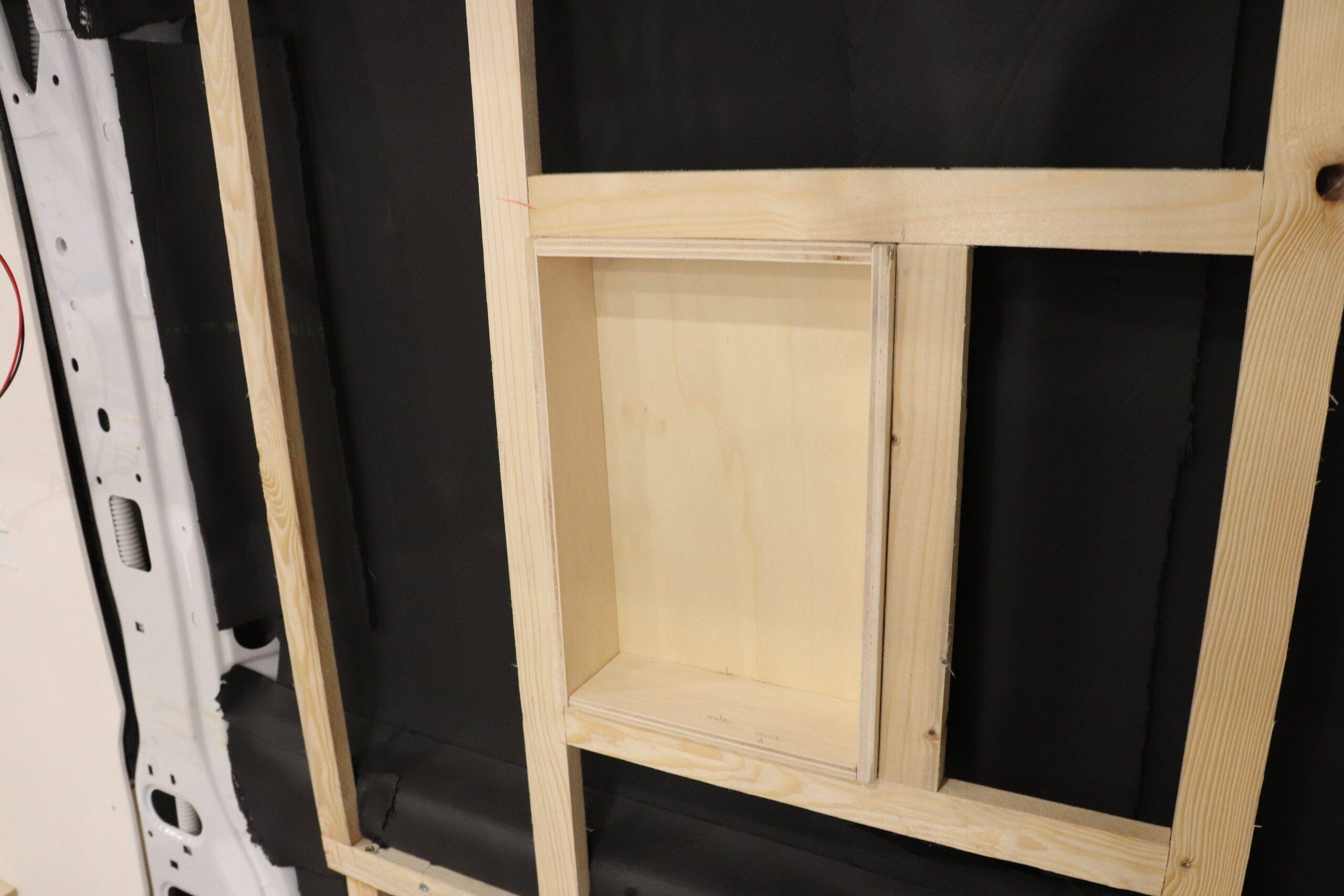 Die linke Seitenwand unserer Nasszelle wird sich neben unserer Küchenzeile befinden und wird später auch daran befestigt. Zusätzlich werden wir sie aber auch in unsere Rückwand sowie an die Unterkonstruktion an der Fahrzeugwand verschrauben.