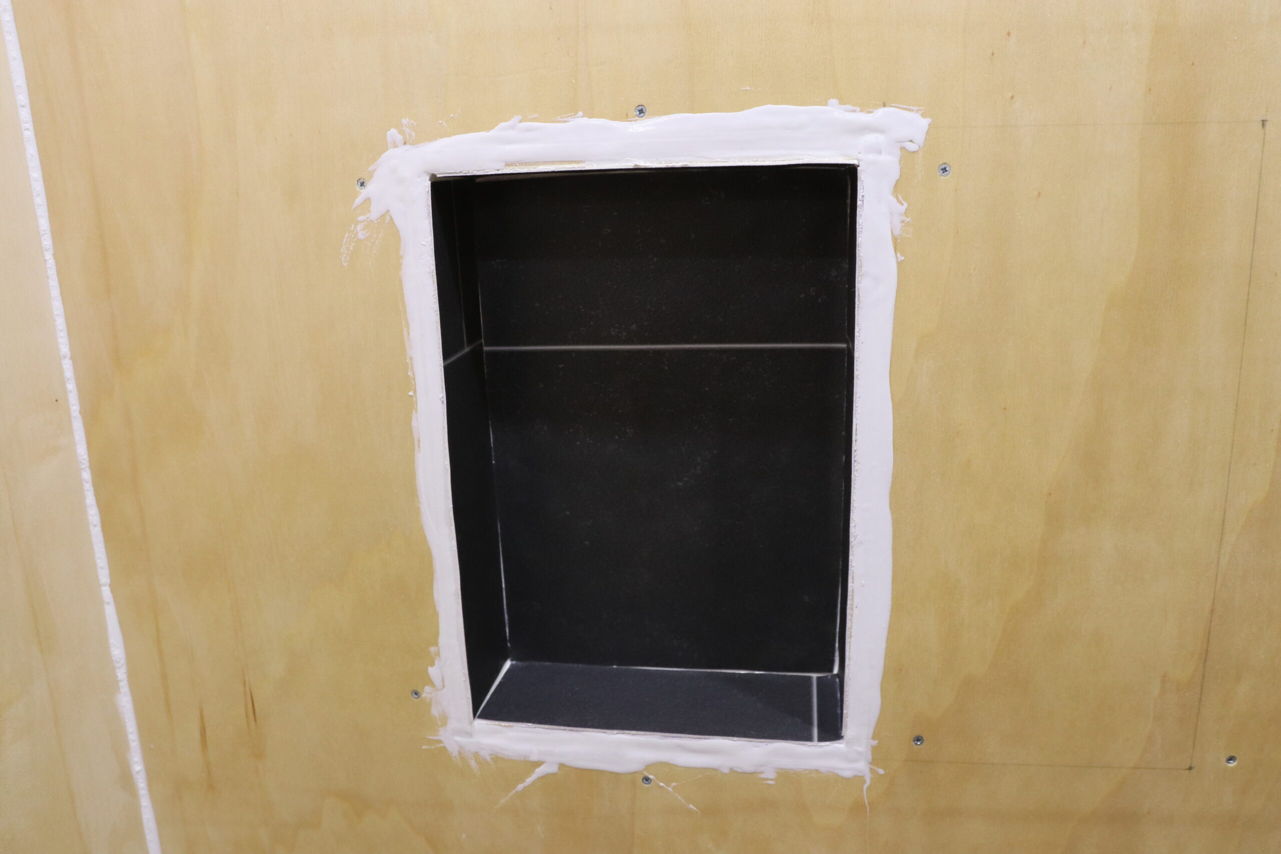 Zusätzlich bauen wir noch ein Shampoofach. Das kann man natürlich auch einfach weglassen und spart sich die Arbeit, aber wir finden die Idee eigentlich ganz cool und möchten es mal ausprobieren. Um zu wissen wie groß es werden soll, orientieren wir uns an den gängigen Größen von Duschgels und Shampoos. Das Shampoofach haben wir in das Grundgerüst von unserer Rückwand integriert und bereits beim Bau dieser darauf geachtet, dass wir an einer geeignete Stelle genügend Platz lassen, wo dann ein Shampoofach entstehen kann. Das Shampoofach bauen wir aus 10 mm Pappelsperrholz, welches wir miteinander verschrauben und dann in unser Gerüst hinter der Wand einsetzen und dort mit Schrauben befestigen. Es ist ca 20 cm breit und 30 cm hoch. Mit dem dauerelastischen Montagekleber versiegeln wir wieder sorgfältig alle Kanten.