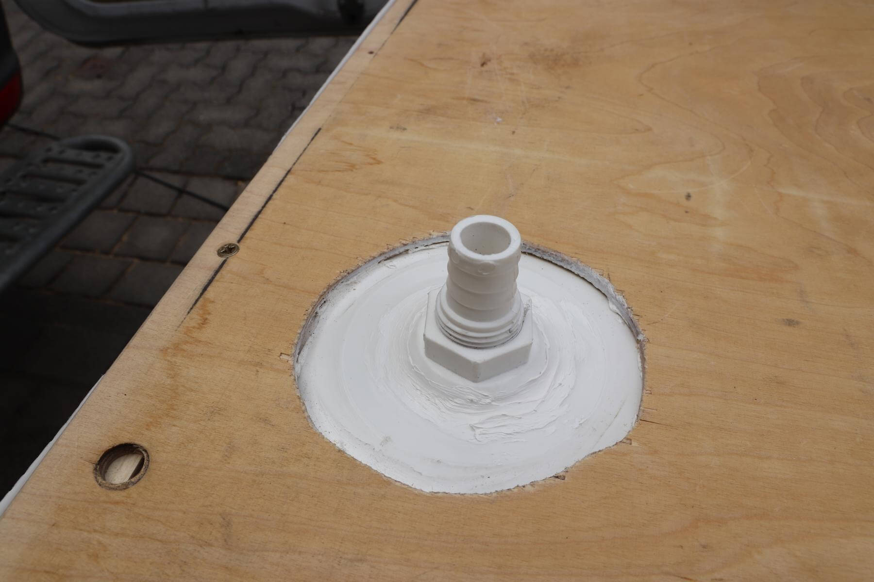 Zuerst bohren wir ein kleines Loch und gucken unter dem Fahrzeugboden, wo der Bohrer heraus kommt. Als das bei keinem Träger ist, bohren wir ein größeres Loch. Anschließend haben wir einen Kronenbohrer genutzt. Dieser muss sich erst durch die Bodenplatte, das Armaflex und schließlich durch den Fahrzeugboden arbeiten. Später werden wir noch einen Abwassertank anbringen.