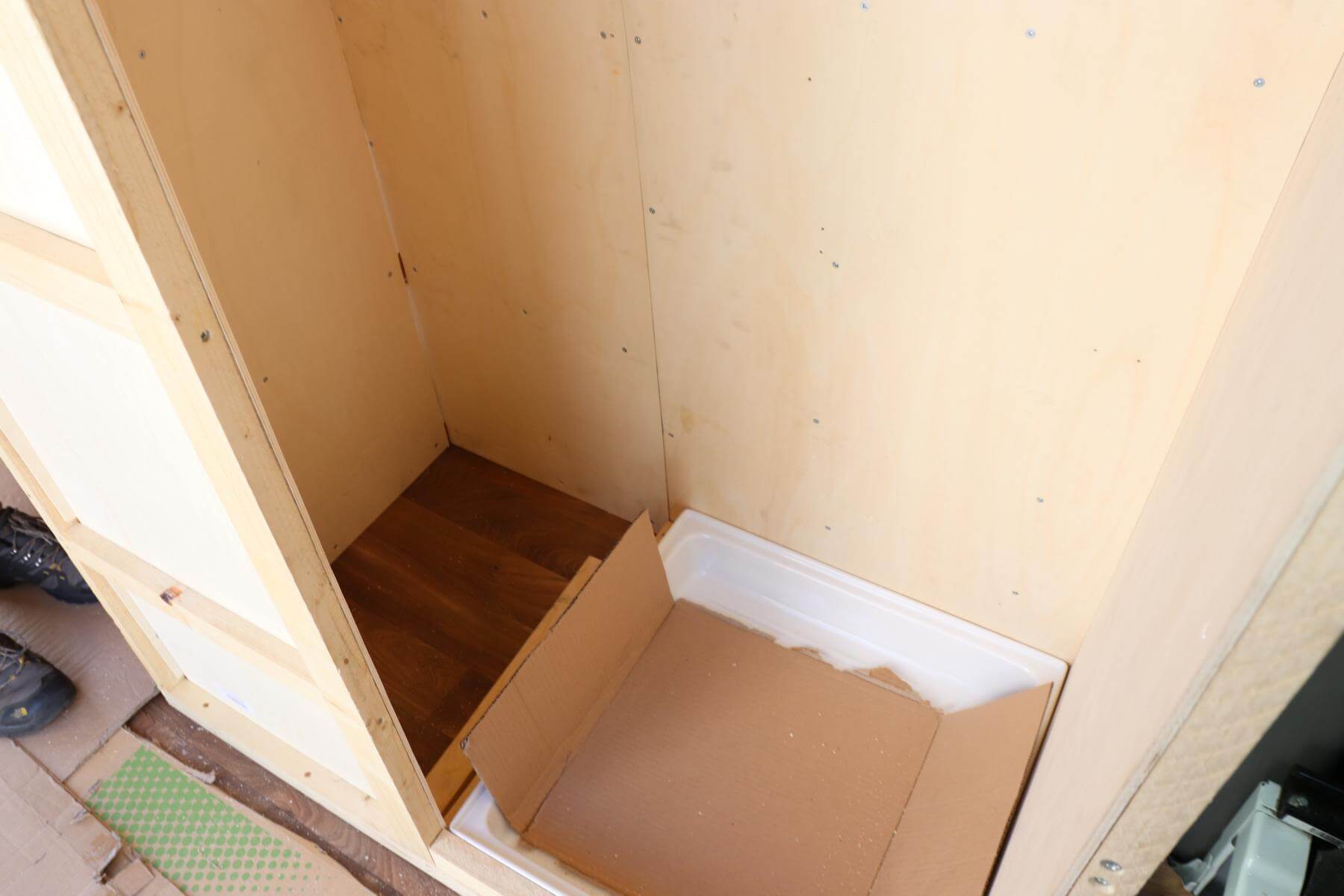 Die Duschwanne besteht aus Kunststoff und wenn sie auf der Bodenaplatte aufsitzt, ziemlich wackelig. Damit die ganze Konstruktion stabiler wird und man nicht Angst hat, dass die Duschwanne unter einem einreißt, möchten wir die Duschwanne noch zusätzlich stützen. Wir haben ein Stück Sperrholzplatte zurecht gesägt und mit Sikaflex 252i* unter die Duschwanne geklebt. Weil die Duschwanne danach immer noch nicht stabil gemug war, haben wir zwischen den Rand Holzlatten geklebt, ebenfalls wieder mit Sikaflex.
