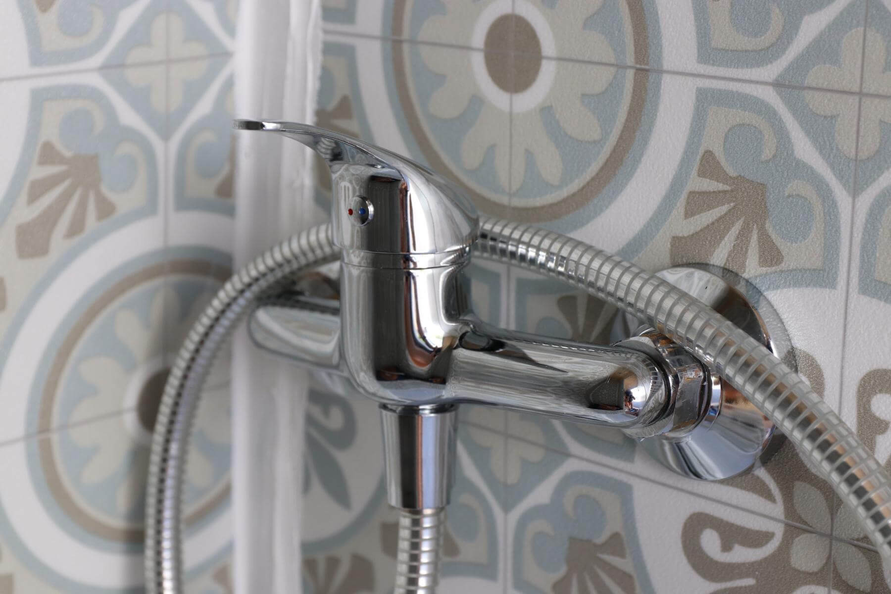 Wir haben uns für eine handelsübliche Duscharmatur aus dem Baumarkt entschieden. Diese ist zwar günstiger, aber leider passen die Wasseranschlüsse aus unserem Camper nicht daran. Somit müssen wir spezielle Verbinder bestellen, die von unserem 10mm dünnen Wasserschlauch auf die Duschanschlüsse passen. Mit einer Wandscheibe haben wir die Duscharmatur an der Wand befestigt. Die Wandscheibe geht in ein kleines Stück Plastikrohr und dieses wiederum an einen Adapter auf eine 10 mm Schlauchtülle für unseren Wasserschlauch. Ziemlich kompliziert, oder? Und teuer sind die ganzen Anschlüsse auch.
