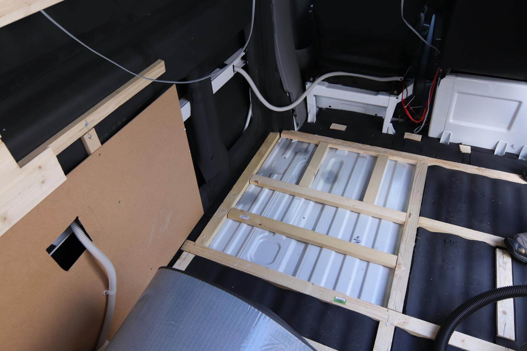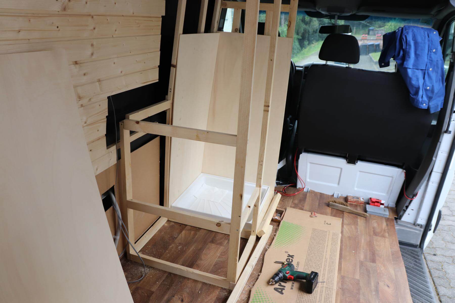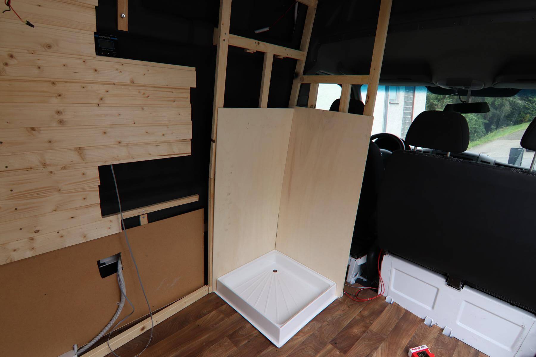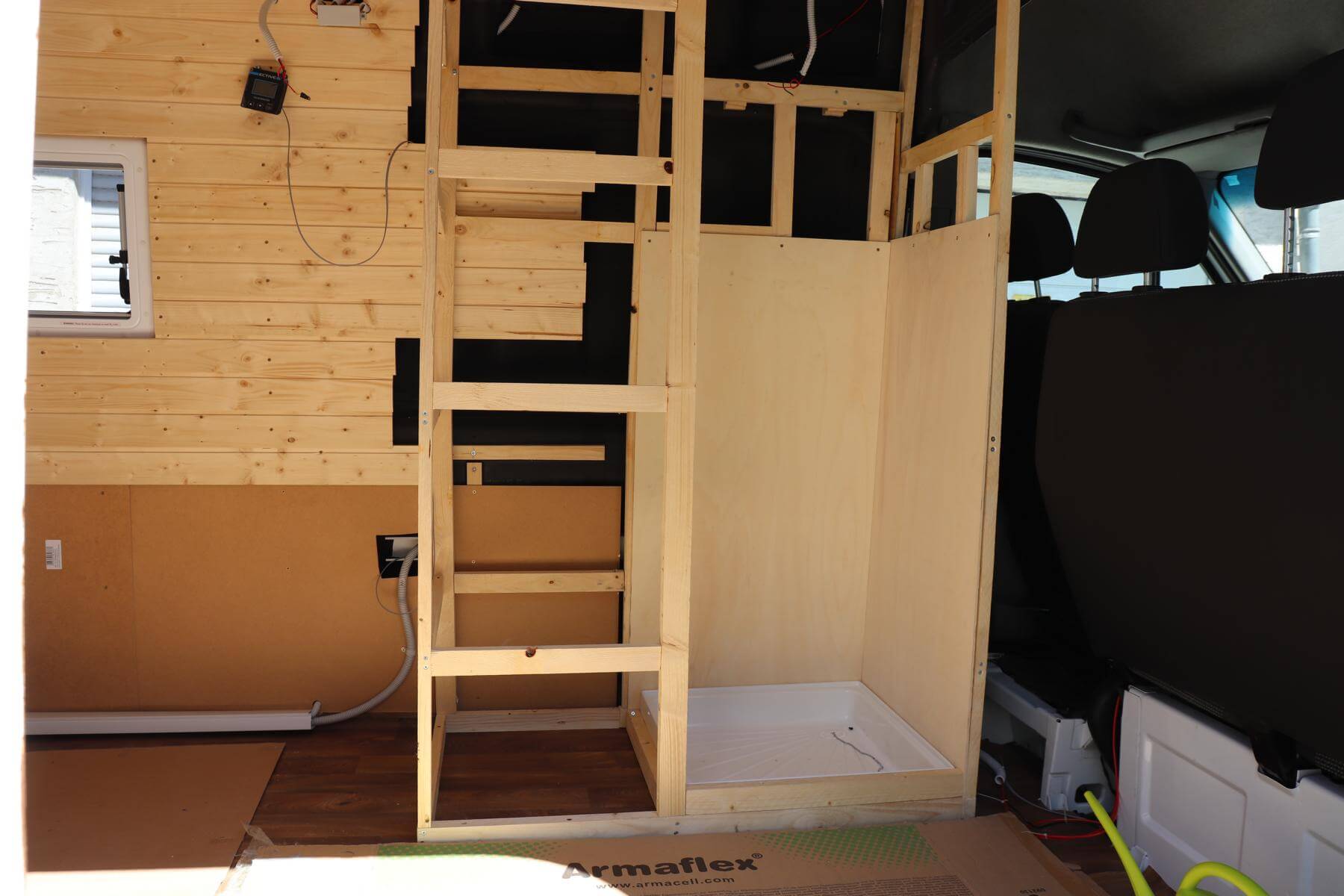 Zuerst platzieren wir unsere 60*60cm Duschwanne* auf den Boden und richten sie aus. Da die Dusche auch einen Abfluss braucht, müssen wir gucken, wo dieser sitzen kann. Dazu krabbeln wir unter den Fahrzeugboden und vergewissern uns mehrfach, dass sich an dieser Stelle kein Träger befindet. Als die Dusche an Ort und Stelle sitzt, markieren wir die Umrisse der Duschwanne mit dem Edding. Das Loch möchten wir erst später bohren. Nach und nach bauen wir mit den Unterkonstruktionslatten unser Grundgerüst auf. Bei den schiefen Seitenwänden ist es gar nicht so einfach.