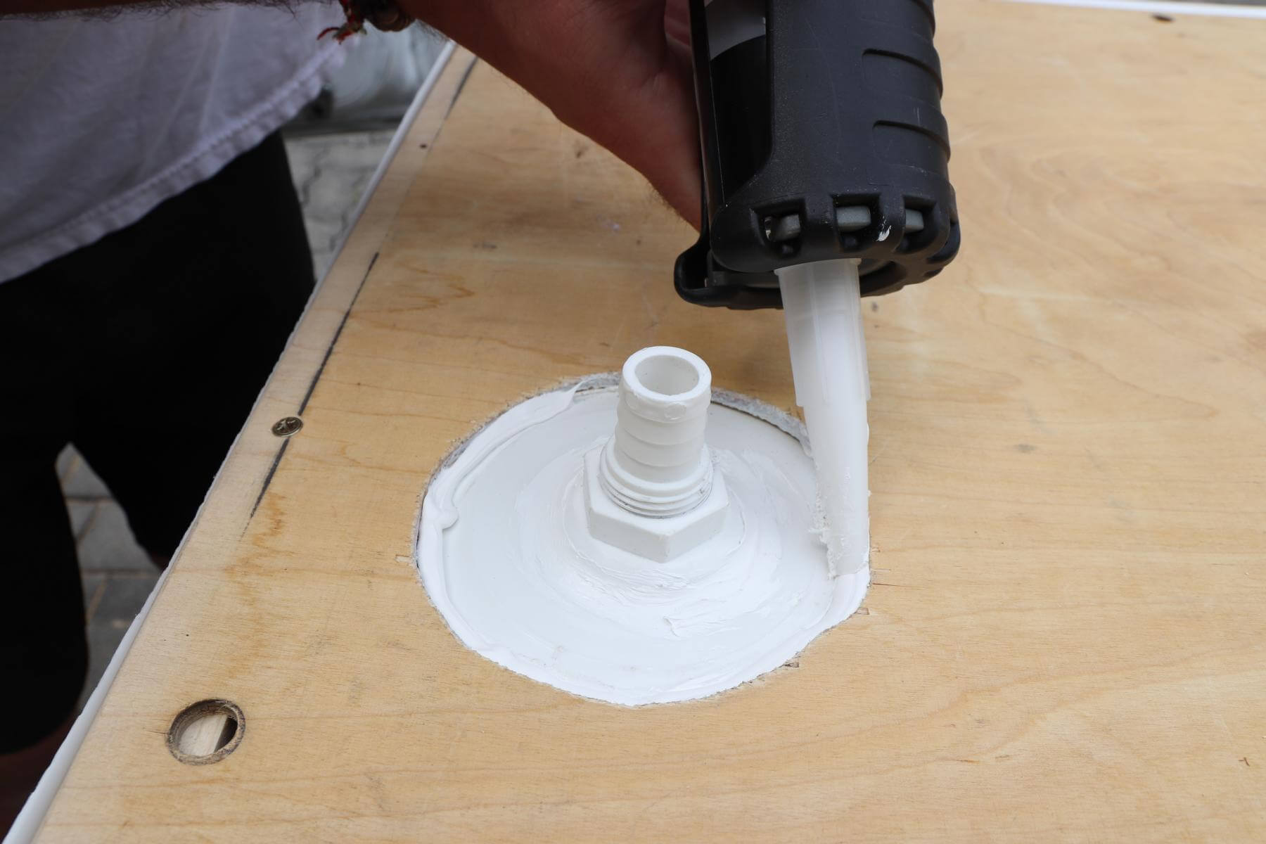 Nun haben wir den Abfluss in die Dusche gesetzt, mit Sikaflex befestigt und mit Dekaseal abgedichtet.