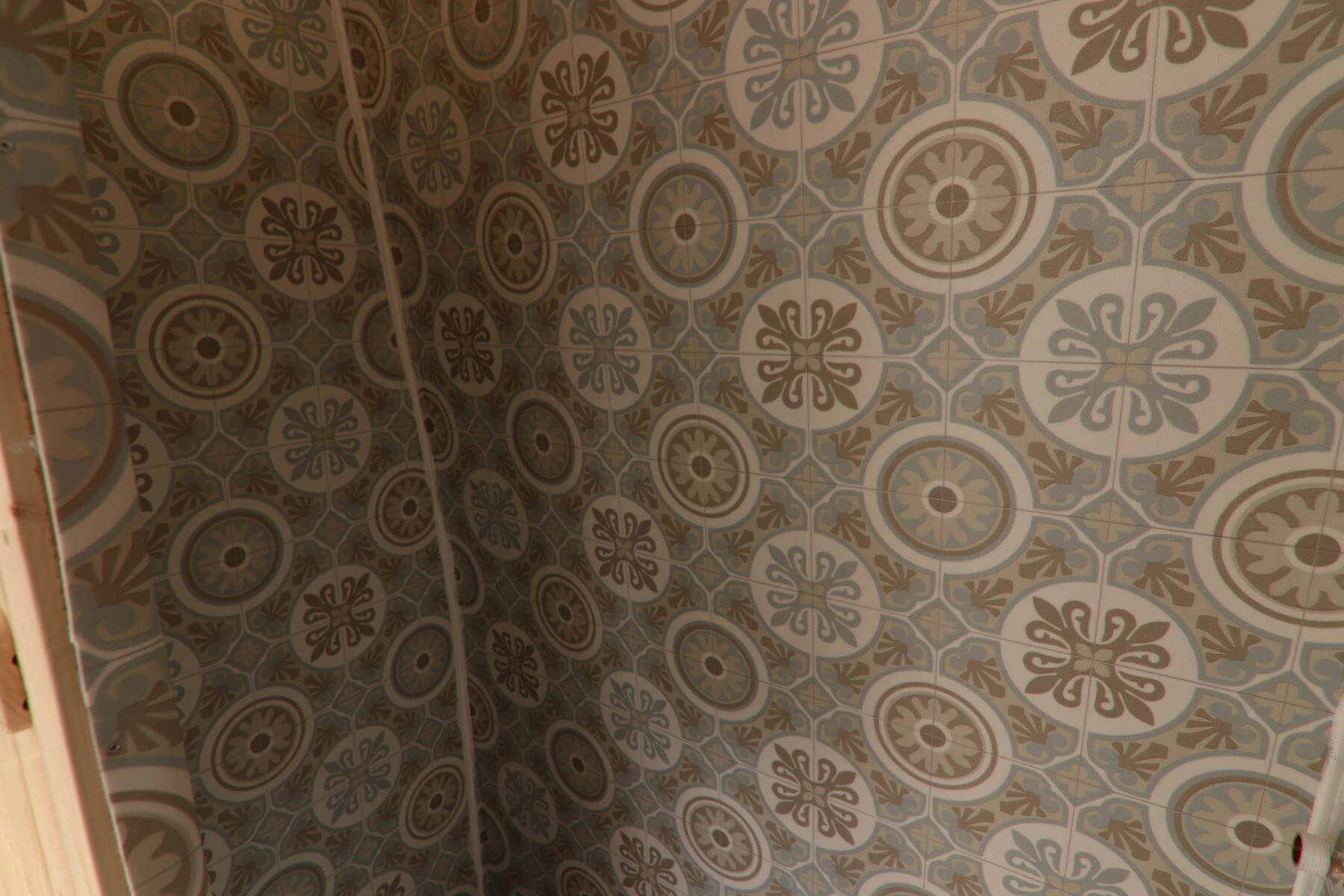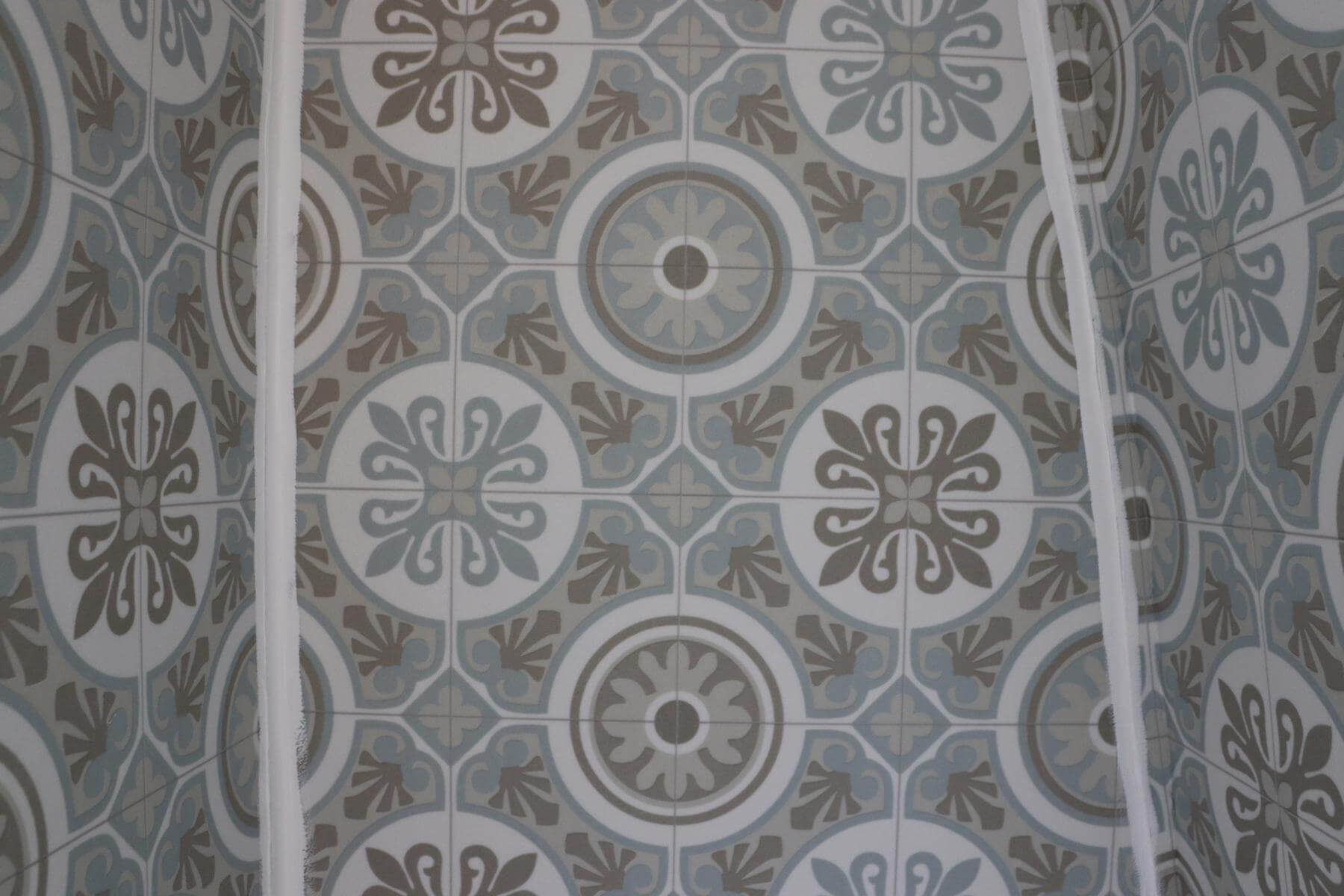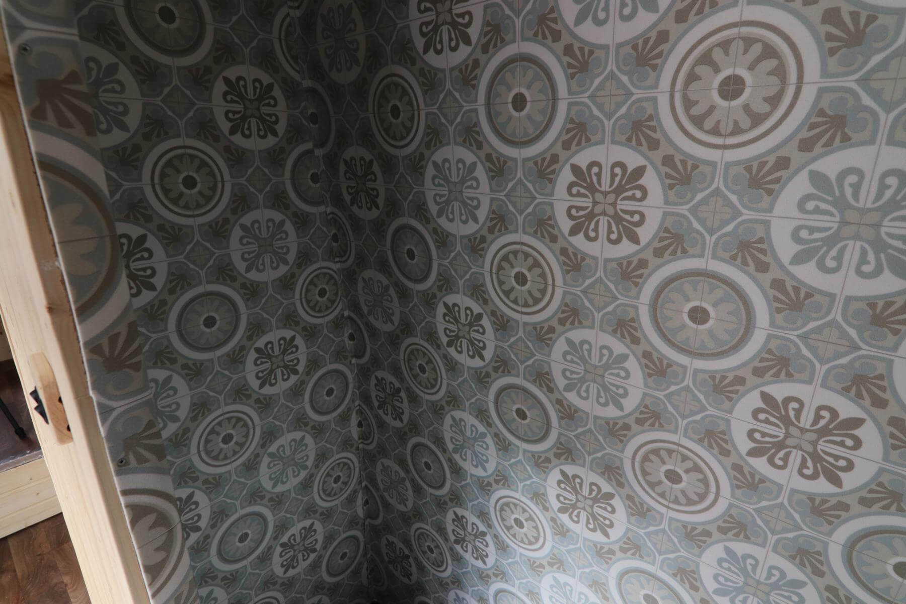 Wir brauchen eine kostengünstige und nicht allzu komplizierte Lösung. PVC Platten sowie Alu Dibond Platten sind sehr teuer und das zuschneiden recht schwer. Man kann sich die Platten auch zuschneiden lassen, aber bei unseren schiefen Wänden geht das mal wieder nicht so einfach. Deswegen entscheiden wir uns für PVC Bodenbelag. Dieser ist günstig und leicht zu verarbeiten. Die Maße kann man sich ganz einfach selber mit einer Schere oder einem Cuttermesser zuschneiden.