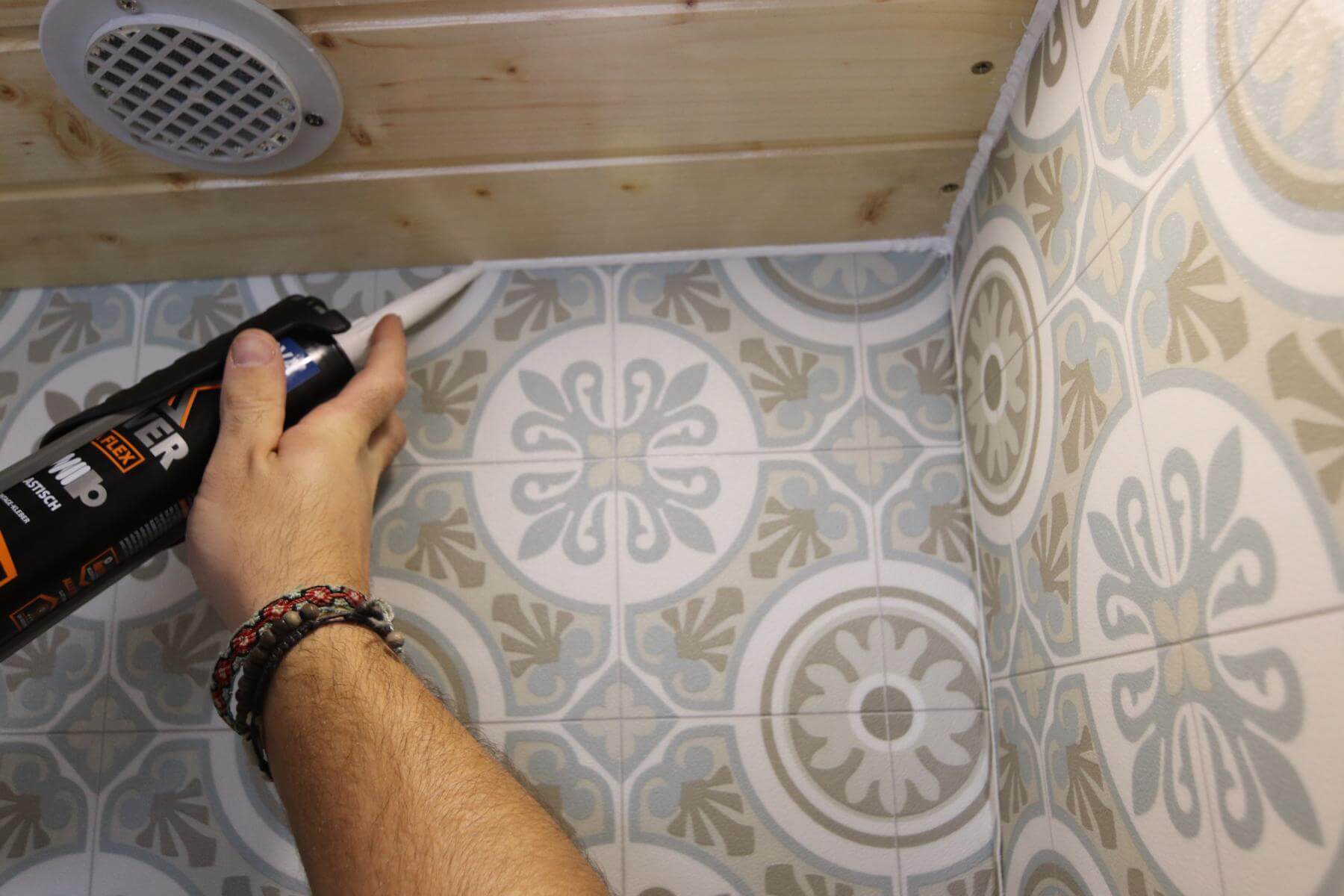 Die Fugen haben wir anschließend mit ordentlich viel Silikon abgedichtet. Auch an den Ecken, wo der PVC von einer Seite auf die andere überlappt, haben wir eine breite Spur Silikon drüber gezogen sowie auch unten, wo das PVC in die Duschwanne lappt und an allen weiteren Übergängen und Kannten.