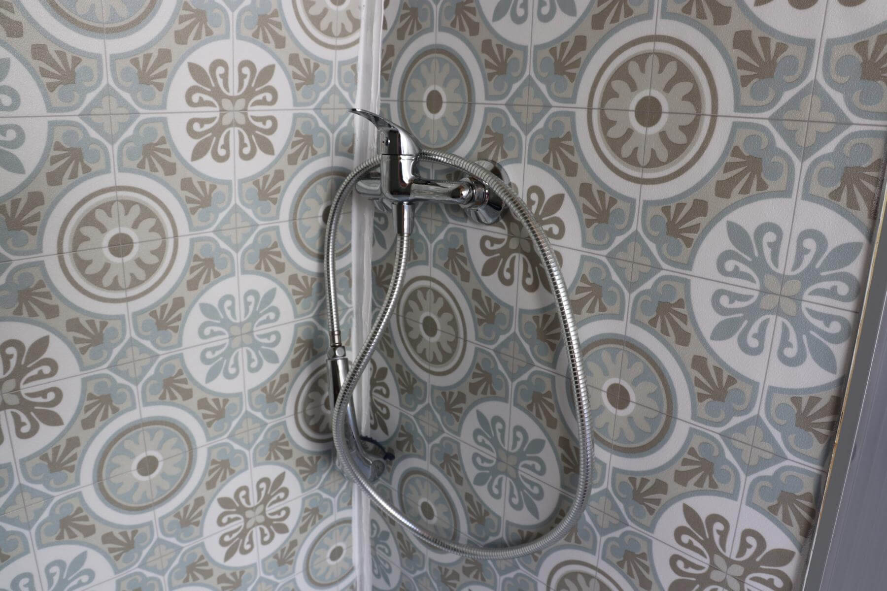 Als letzten Schritt haben wir die Stange für den Brausekopf befestigt. Die Duscharmatur haben wir ja bereits vor dem Verleges des PVC schon angebracht.